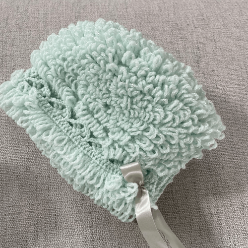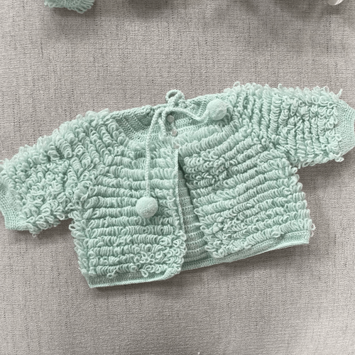 This vintage outfit is from the 60s and is new without tags, never been used. Not only is it in pristine condition, but the estate I got it from never had children. It is a loop yarn cardigan, bonnet, and booties in seafoam or mint green. No tags anywhere but not homemade. The bonnet has a loop satin ribbon. The booties measured 3.75 inches heel to toe on the outside and have pom-poms at the toe. The cardigan sweater has three button closure up at the neck and open below with neck tie with pom-poms. It measures 9.5 inches shoulder to him and 12 inches armpit to armpit. Such a sweet addition or gift for the newborn in your life. No odors or stains from storage.