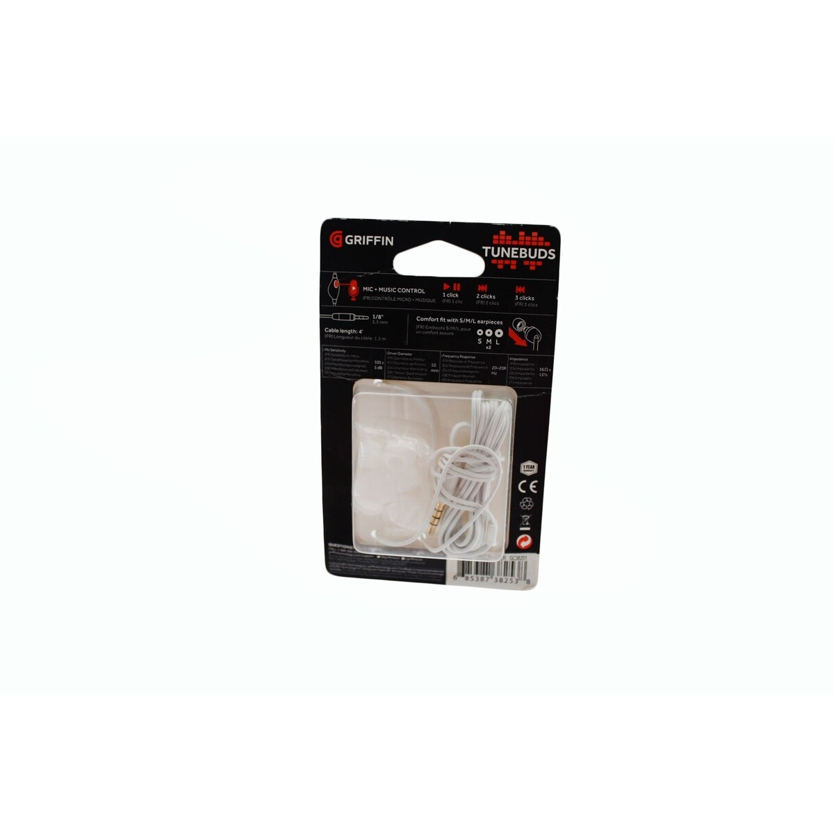 Griffin TuneBuds in-ear headphones provide a comfortable and secure fit for everyday listening. These wired earbuds feature an integrated microphone and multi-function music control button, allowing for easy playback management and hands-free calls. The package includes three sizes of silicone earpieces (Small, Medium, Large) to ensure a custom seal for noise isolation. Designed with a standard 3.5mm (1/8") audio jack, they are compatible with a wide range of smartphones, tablets, and laptops.