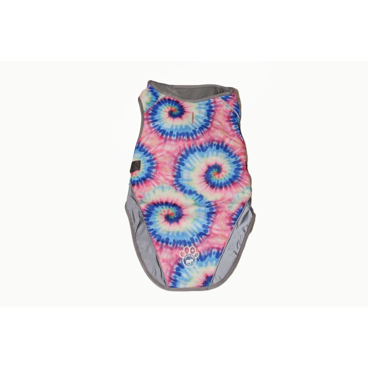 Canada Pooch tie-dye dog cooling vest features a vibrant swirl pattern in pink, blue, and yellow. Designed with a breathable grey mesh lining and adjustable side straps with buckle closures, this lightweight harness-style vest provides a comfortable fit for active pets. The functional design includes a reflective paw logo on the back and grey piping for added visibility during outdoor adventures.