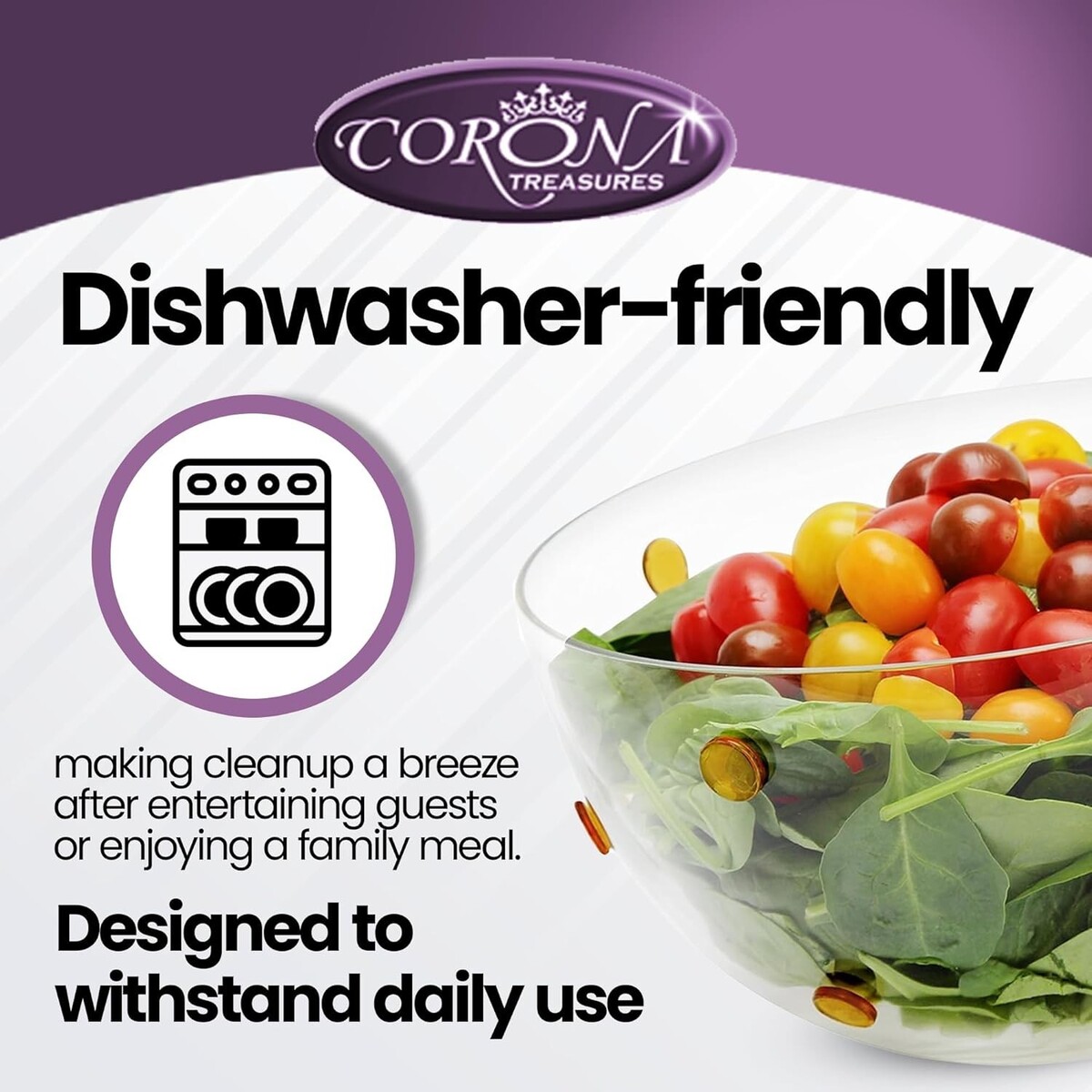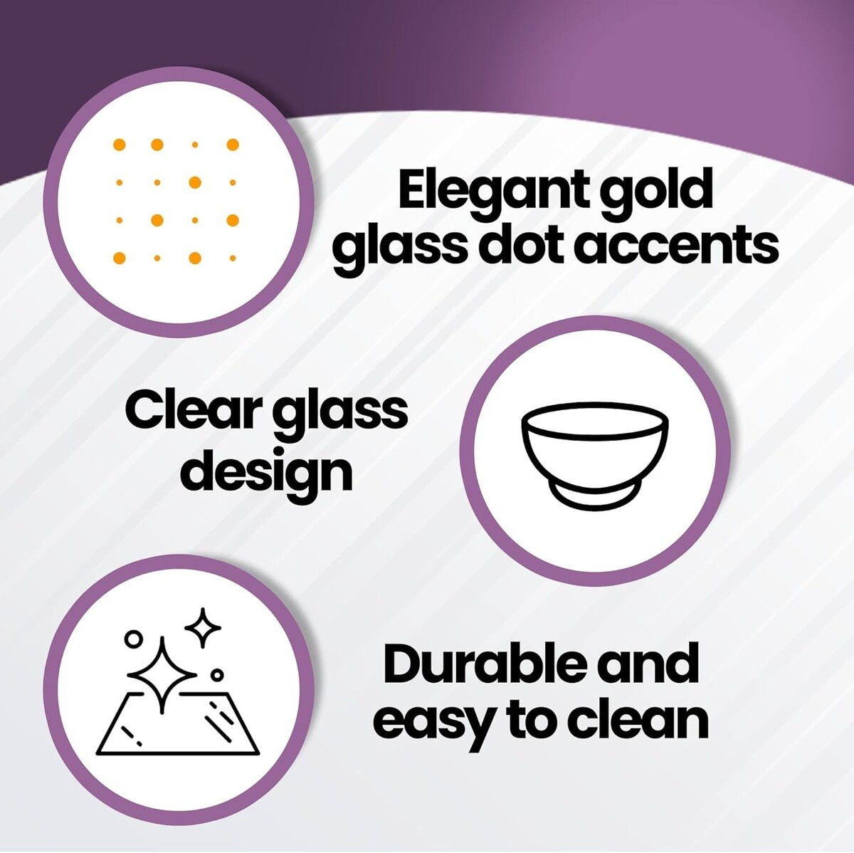 This elegant glass serving bowl by GAC Great American Classics combines refined style with everyday practicality. Crafted from high quality clear glass, the bowl beautifully showcases the natural colors of salads, fruits, and culinary creations, making every presentation visually appealing. The exterior is enhanced with delicate gold glass dot accents that add a touch of luxury without overpowering the design, allowing it to blend effortlessly into both casual and formal table settings.