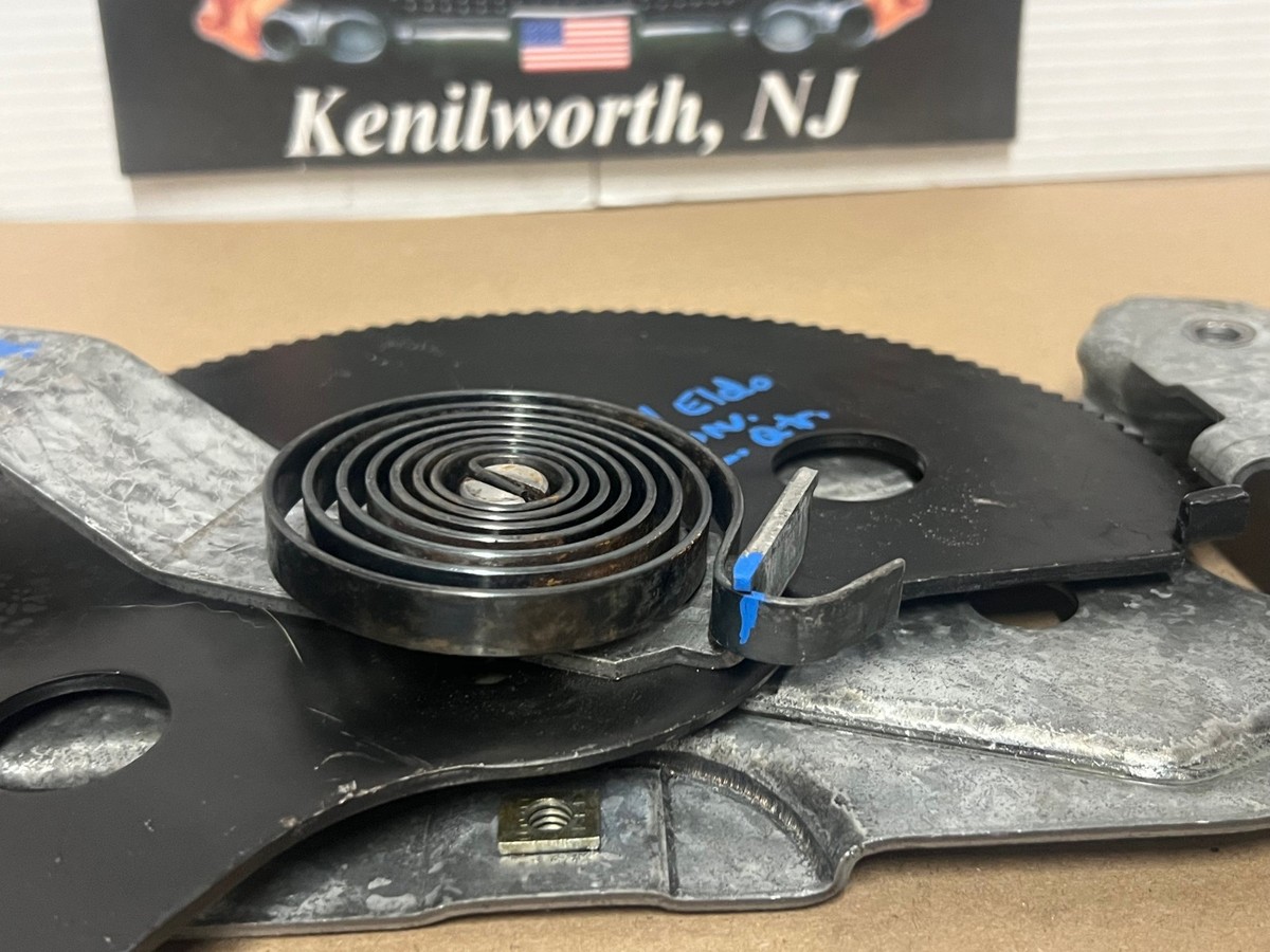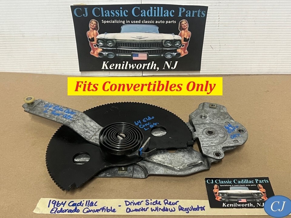 This OEM rear quarter window window regulator is in excellent condition. Overall nice clean condition, not all rusted like most. Teeth on regulator all look good, no heavy wear, average wear typical for a used part its age. Lever arm moves as it should. Spring tension is good. Roller is intact, not frozen. All pivot points should be re-lubricated prior to installing to extend longevity. This was removed from a 1964 Cadillac Eldorado Convertible, but may fit convertible vehicles listed in