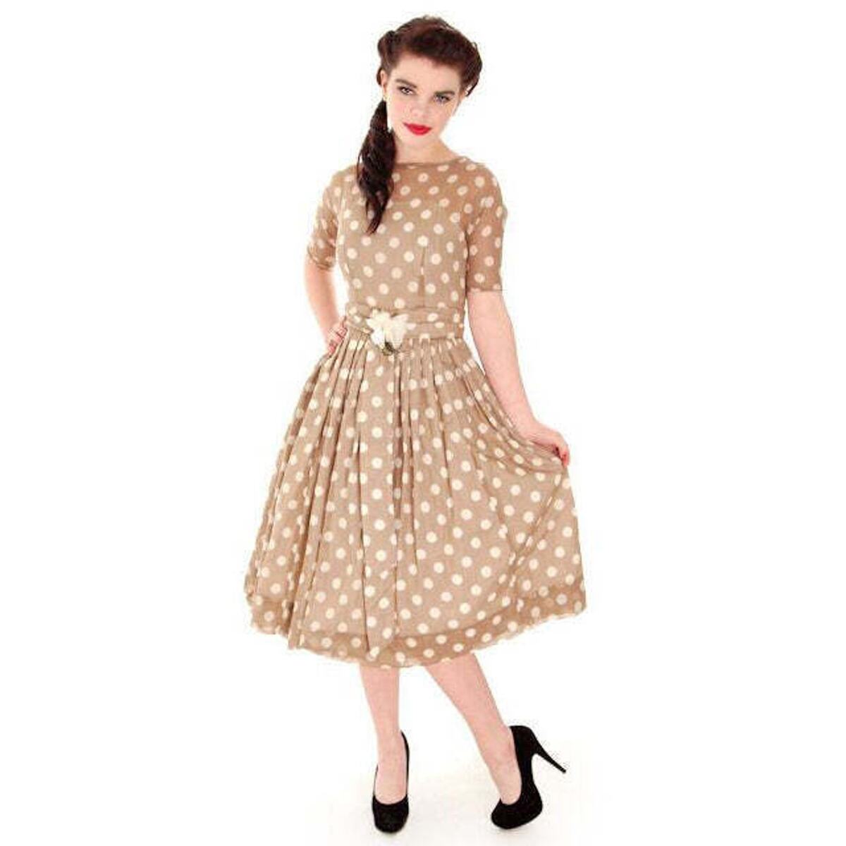 VTG 1950s Taupe Polka Dot Sheer Cotton Dress New Look
