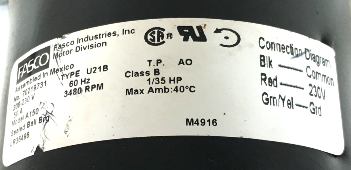 This is FASCO 70219731 Draft Inducer Blower Motor Model A150 3480 RPM 1/35 HP 208/230V used part.
