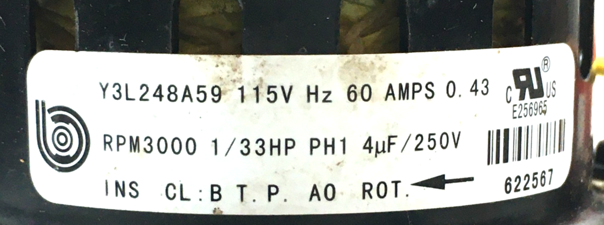 This is Goodman Amana Y3L248A59 Furnace Draft Inducer Motor 622567 115V 1/33 HP 3000 RPM used part.
