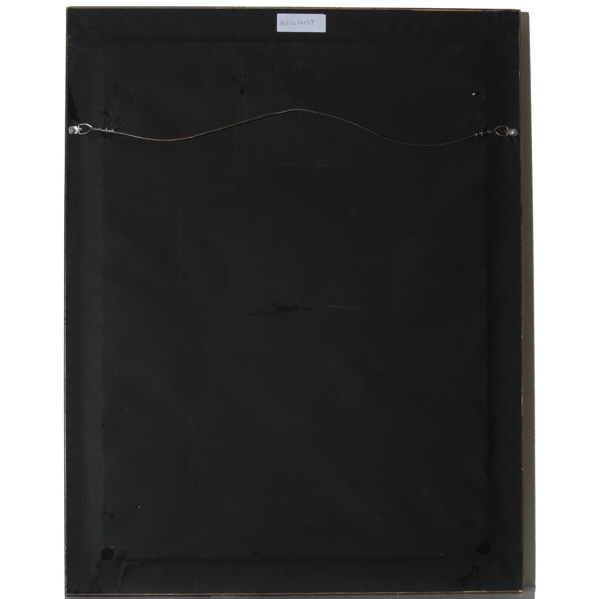 The piece comes housed in a dark, metallic colored wood and glass frame