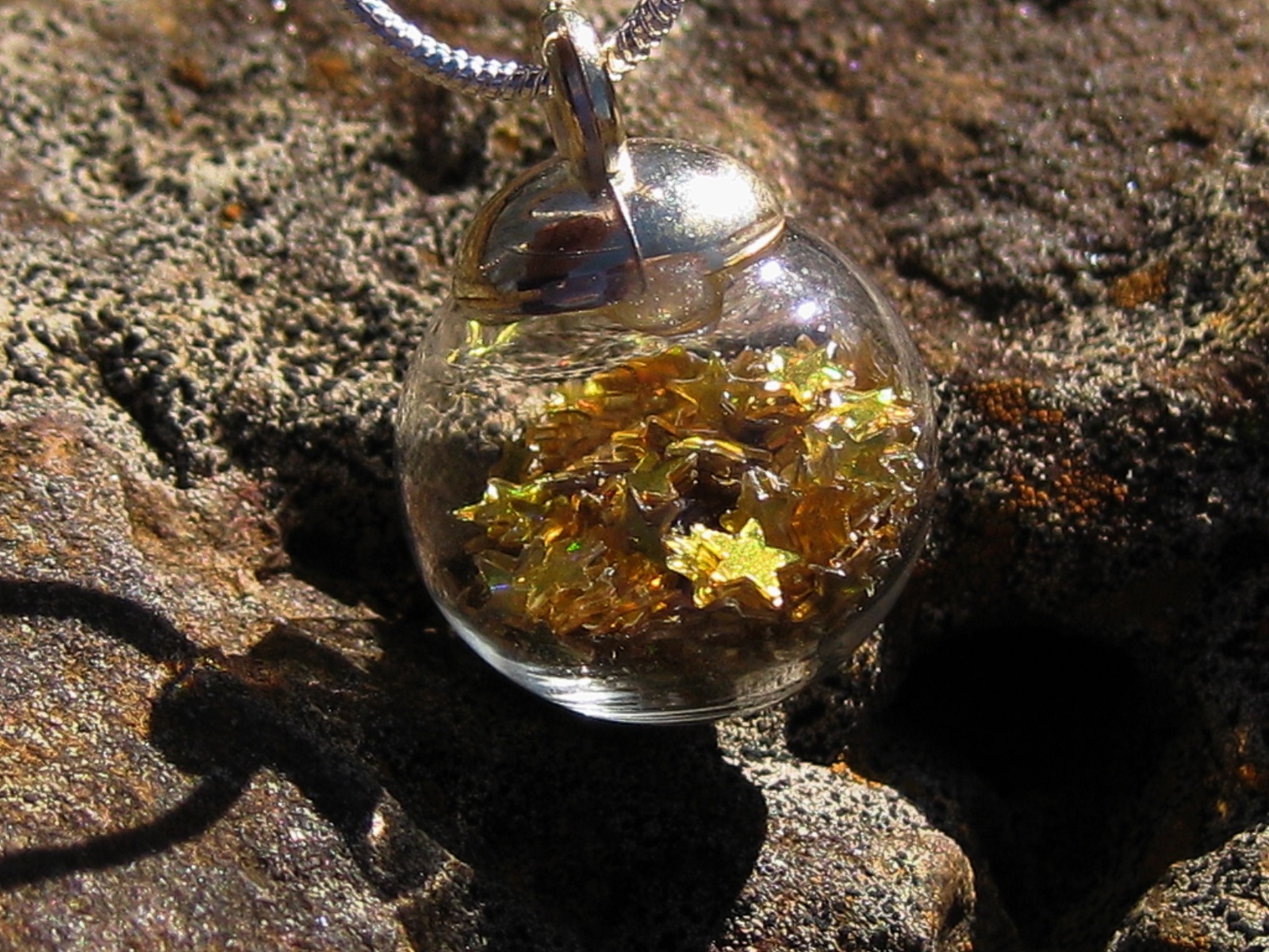 PENDANT: beautiful glass orb with glittery stars inside. The stars move about as you do. Pendant comes with a recharging chain.
