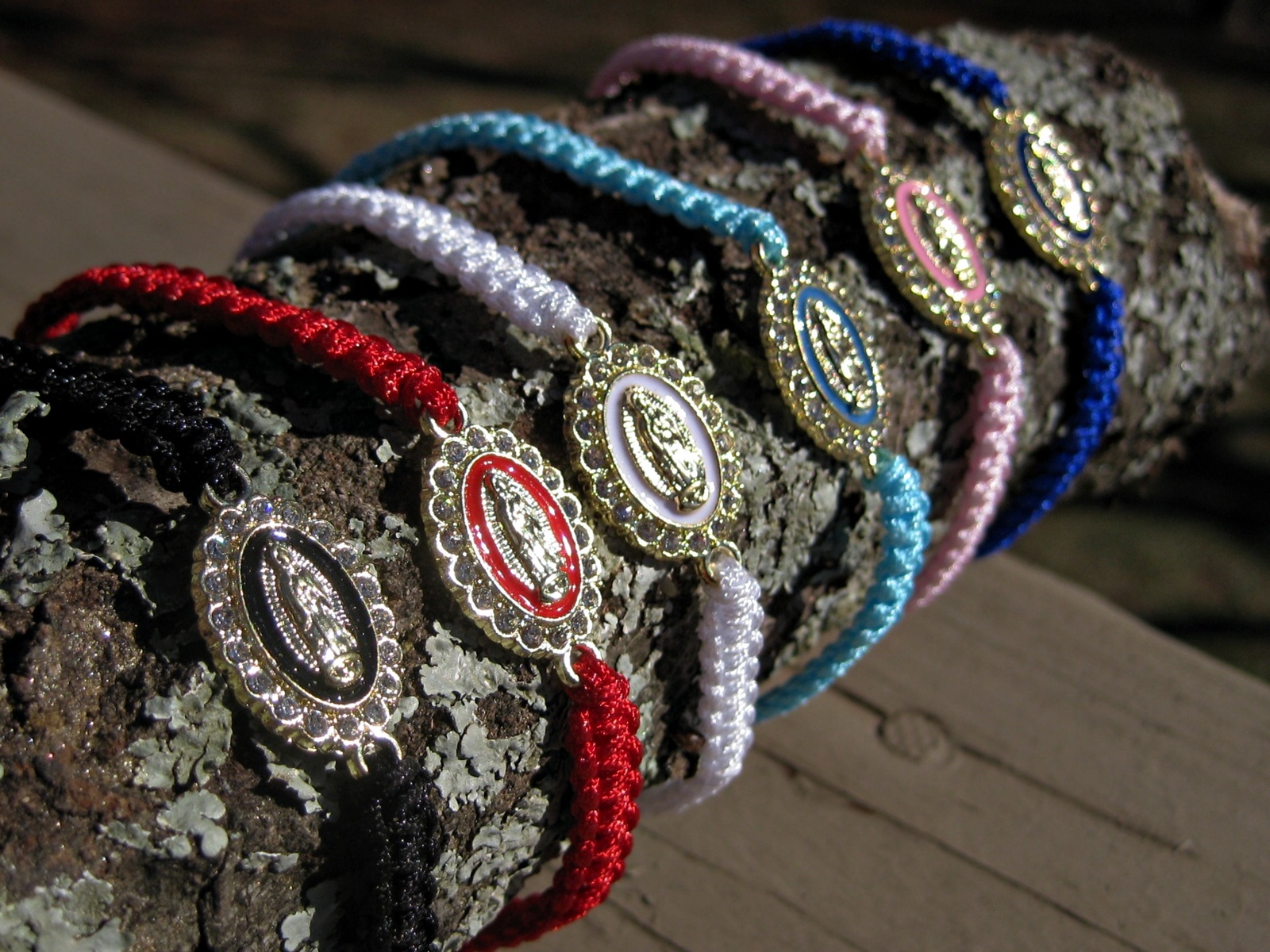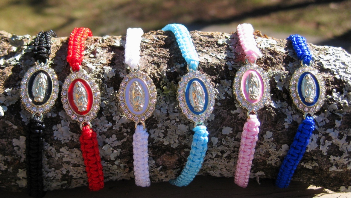 Bracelets are braided adjustable cord with the image of the Lady of Guadalupe in the center surrounded by rhinestones. Unisex.