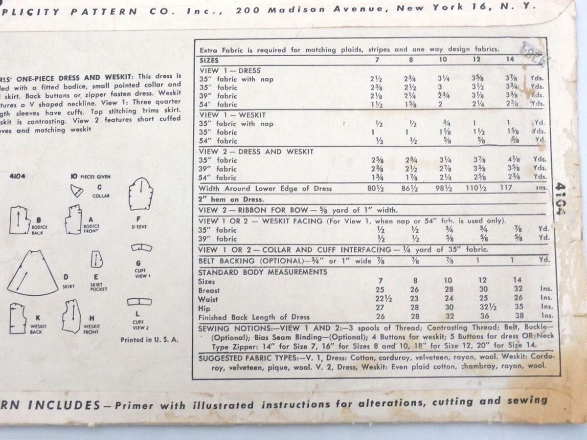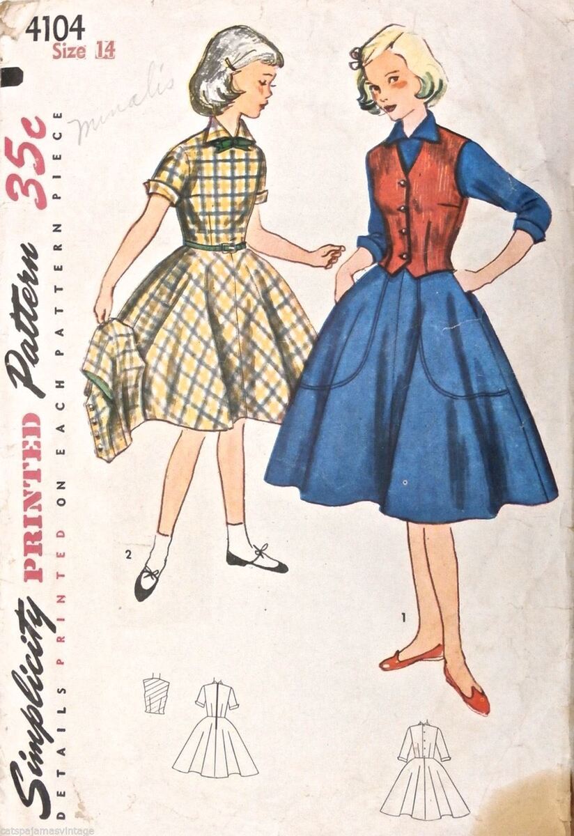 VTG 1950s Sewing Pattern Simplicity #4104 Girl's Full Skirt Dress & Weskit SZ 14