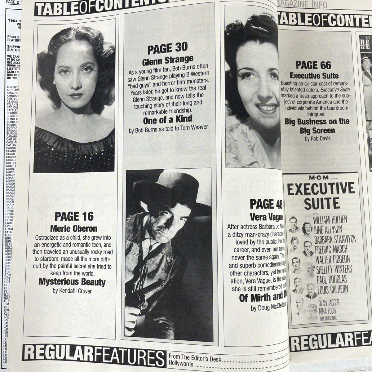 Beyond the monster classics, this issue offers in-depth profiles on legendary stars. Explore the unique career of Glenn Strange, a true one-of-a-kind performer, and uncover the mysterious beauty of Merle Oberon. Discover the mirth and men surrounding Vera Vague, and celebrate the vivacious talents of Jane Nigh, Nan Leslie, and Paula Corday. With rich content from contributors like Tom Weaver, Bob Davis, Doug McClelland, and Colin Briggs, this magazine is a treasure trove of classic film history and fascinating behind-the-scenes stories, making it an essential addition to any film lover's collection.