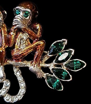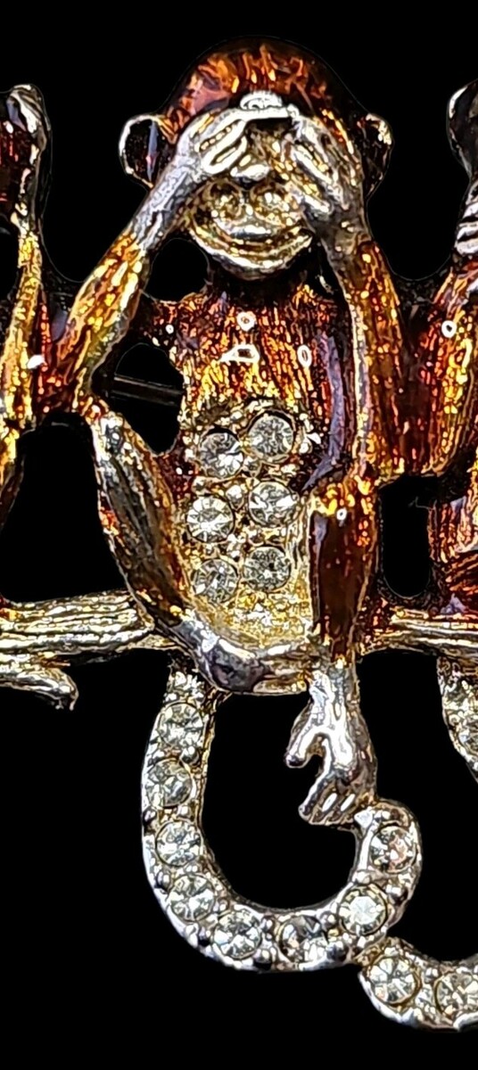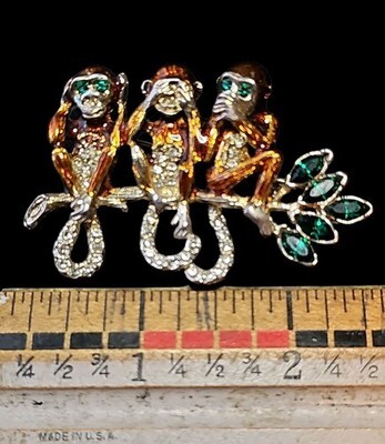 Vintage figural brooch featuring the classic Three Wise Monkeys motif ? see no evil, hear no evil, speak no evil.