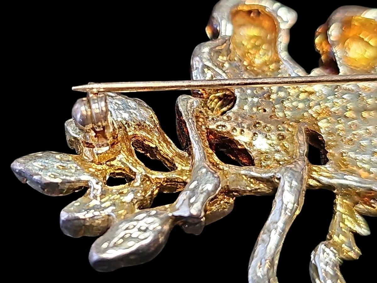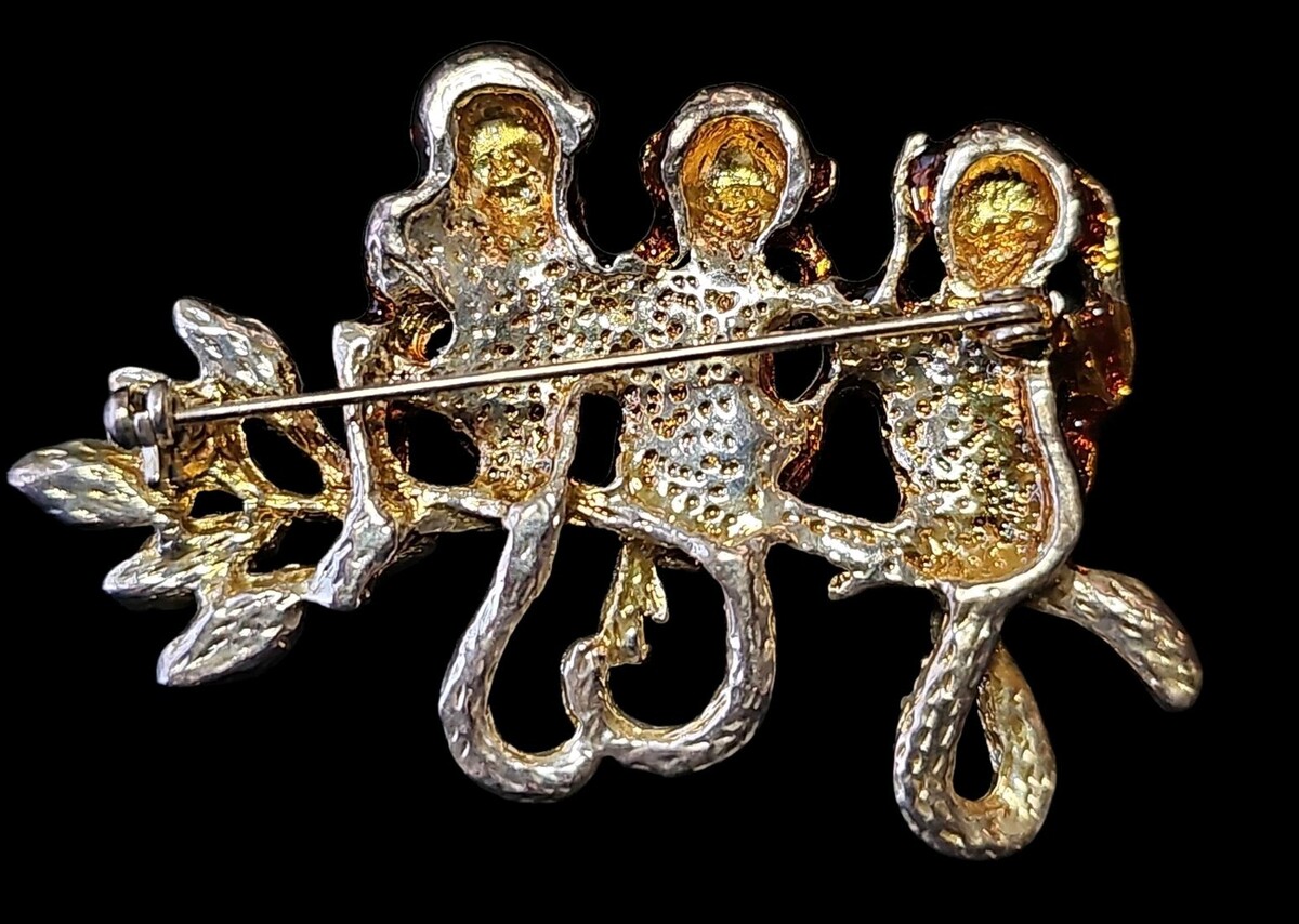 This piece is beautifully done in gold-tone metal with rich enamel detailing, clear rhinestone accents, and striking green rhinestone eyes and leaves. The monkeys are perched along a branch, each rendered with excellent texture and dimensional detail. The combination of sparkle and enamel gives this brooch strong visual impact both on display and when worn.