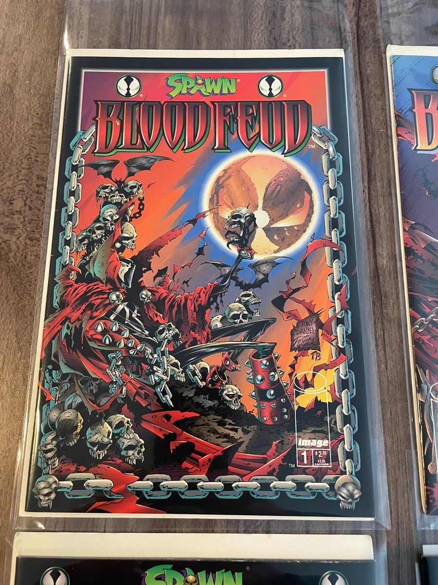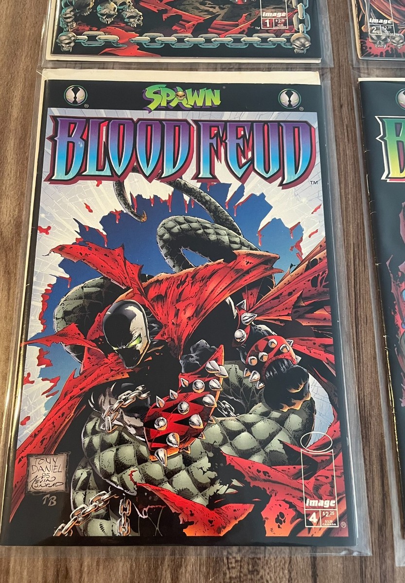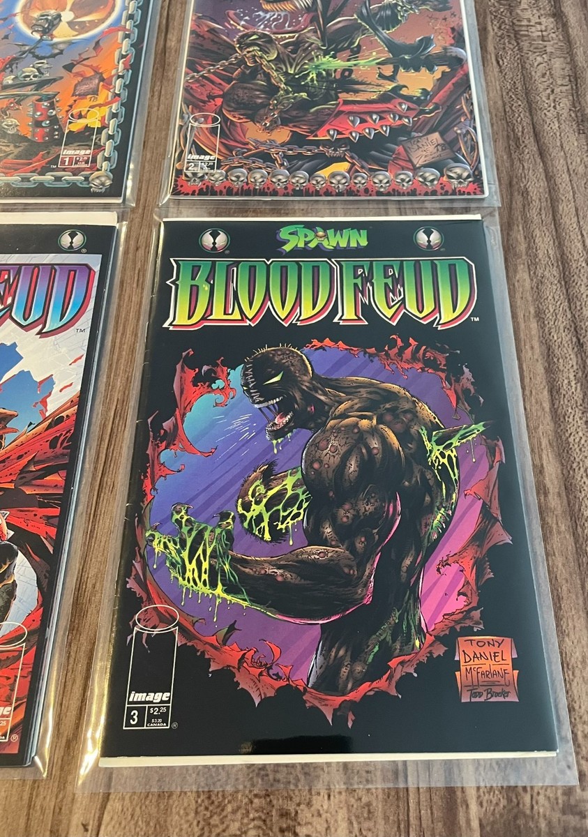This is a Vintage SPAWN BLOOD FUED Image Comics Comic Book Lot 1-4 Set From 1995. Boarded and Bagged from original purchase. They are in great condition. No Creases or Defects. Pictures are of actual Item being sold so you can see the condition. I don't use stock pictures. ELAG