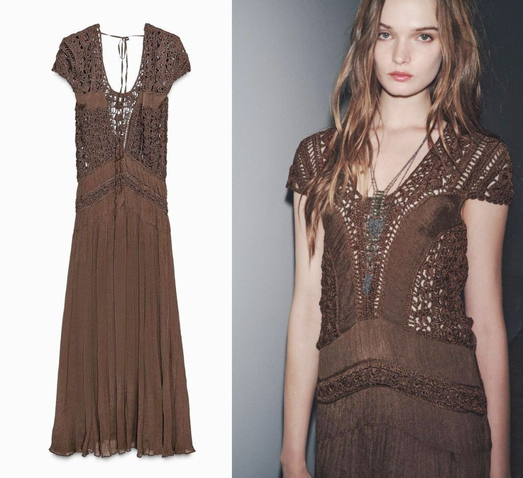 NWT $219 ZARA BROWN ZW COLLECTION COMBINATION CROCHET EMBROIDERED DRESS M
