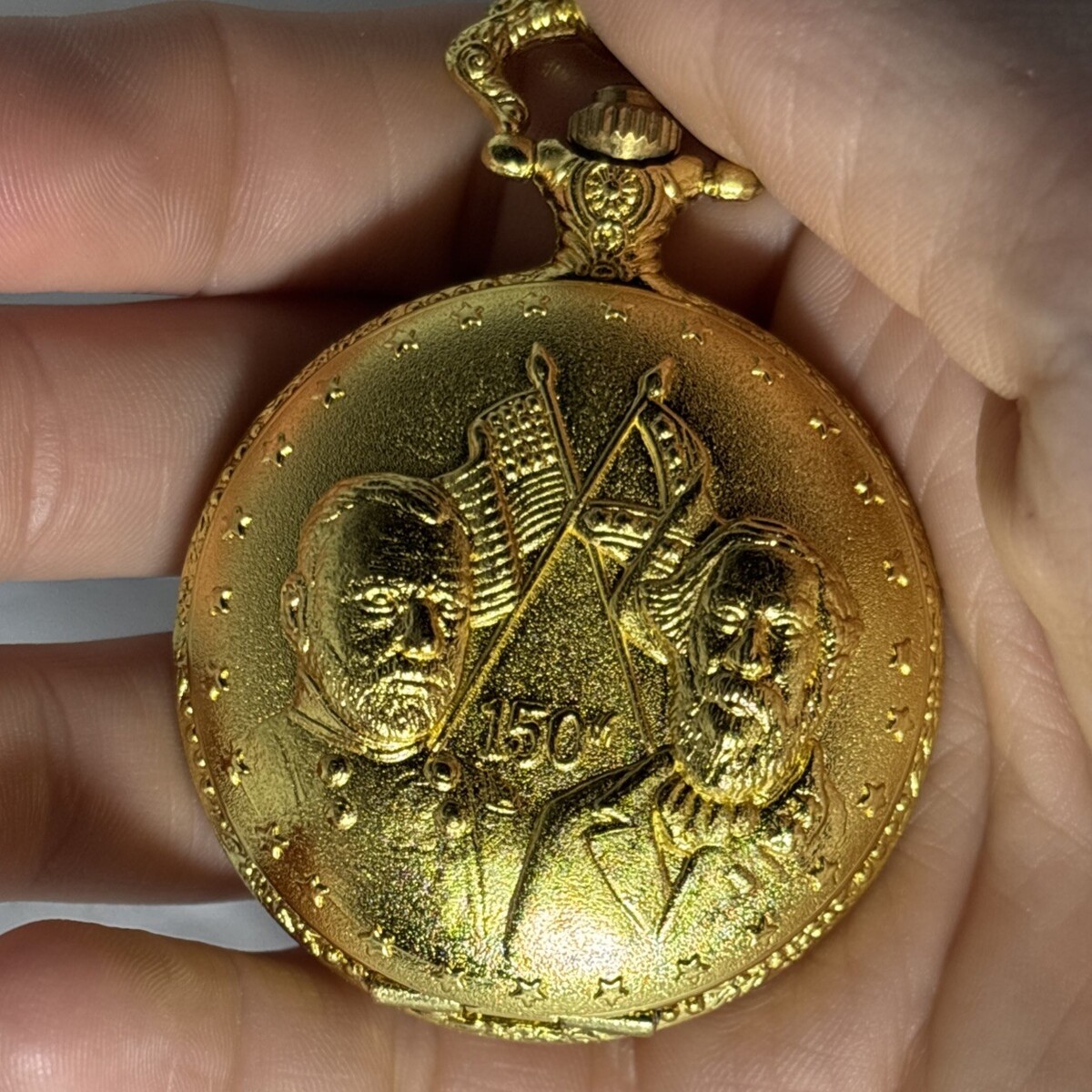 This NEW Vintage/Antique Golden Circular Pocket Watch from America features a Mechanical (Automatic) movement with a Half Hunter closure. The watch has Roman Numerals on the white dial, housed within a yellow gold plated case. With a military style design and a flag and political theme, this pocket watch is a unique and stylish accessory for men who appreciate vintage timepieces. It comes with the original box/packaging, making it a perfect addition to any watch enthusiast's collection. PLEASE NOTE, this product has its original box but NO original papers.