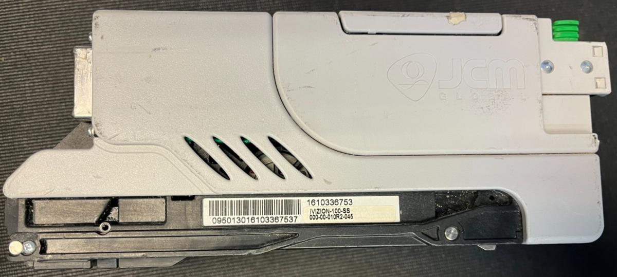 JCM Global iVizion?100?SS single?bill validator with attached cash cassette, removed from a working kiosk/ATM environment and not tested after removal. Unit shows typical cosmetic wear such as scuffs, label residue, and scratches on the housing, but no obvious cracks or missing parts as seen in the photos. This iVIZION SS model uses CIS imaging for full?note capture and is designed for high?reliability cash handling in gaming, kiosk, and payment applications.