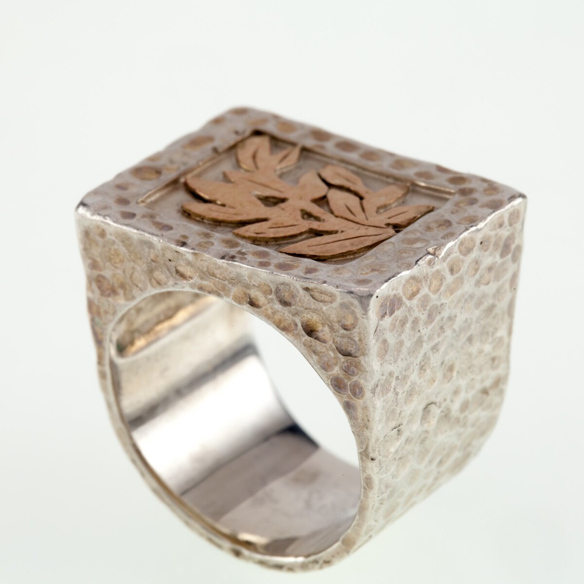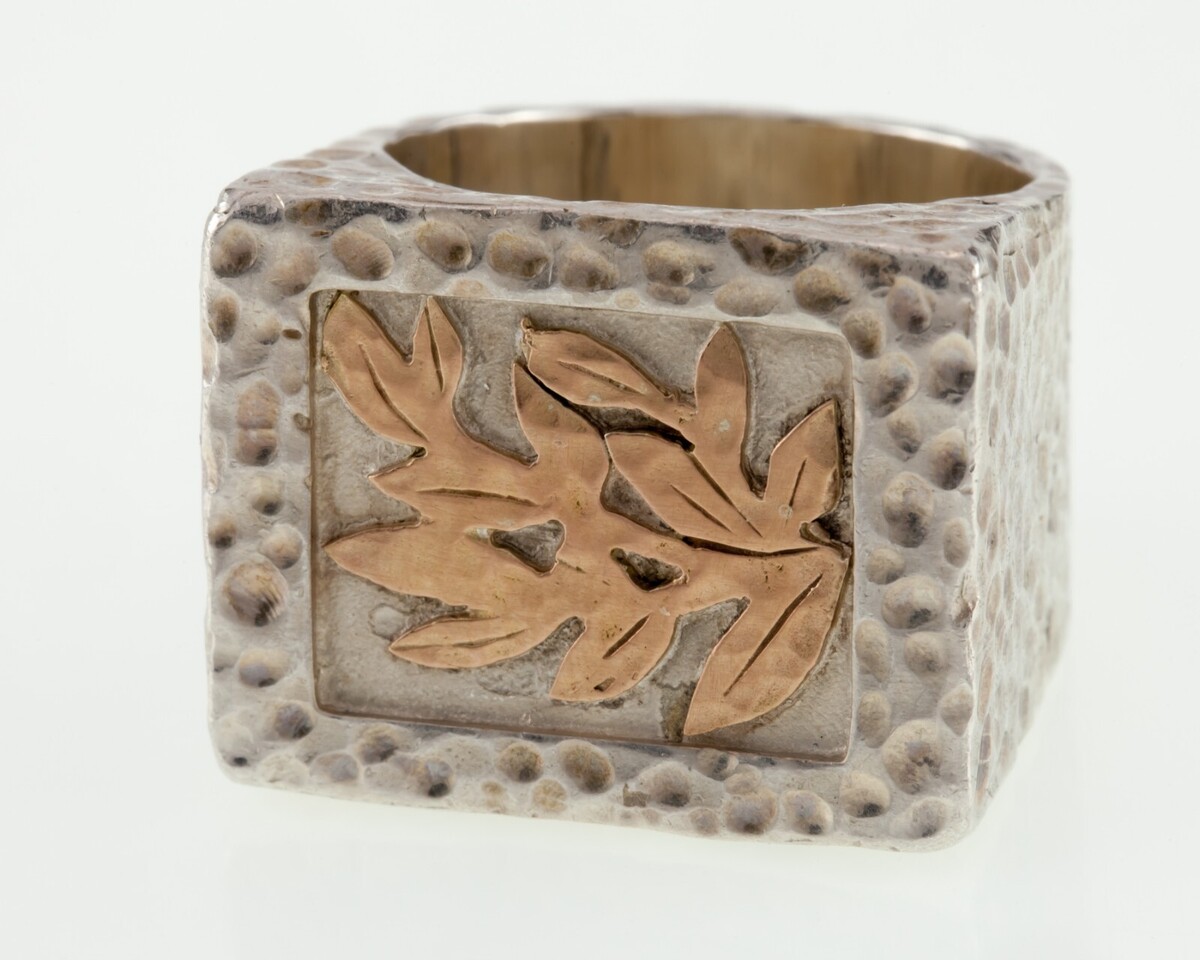 Texture Sterling Silver Band with a Gold Tone Leaf Design Ring Size 10
