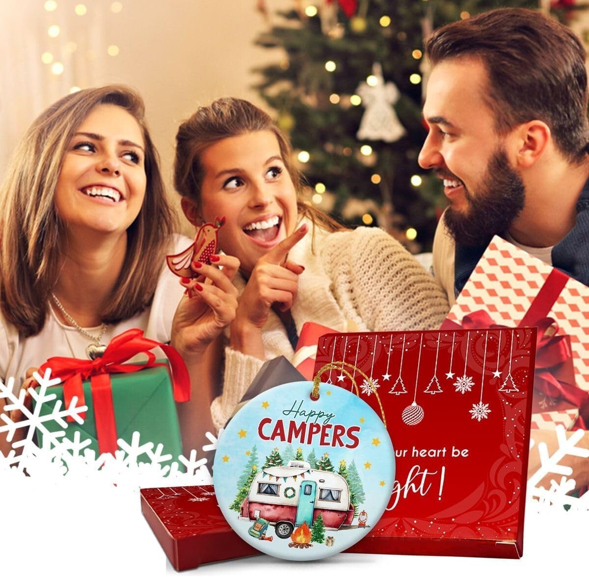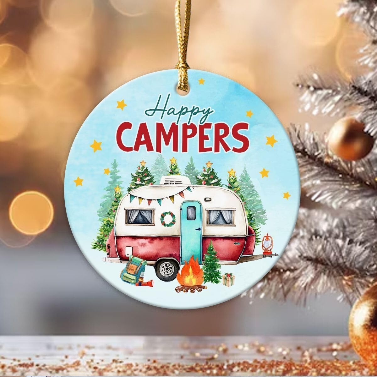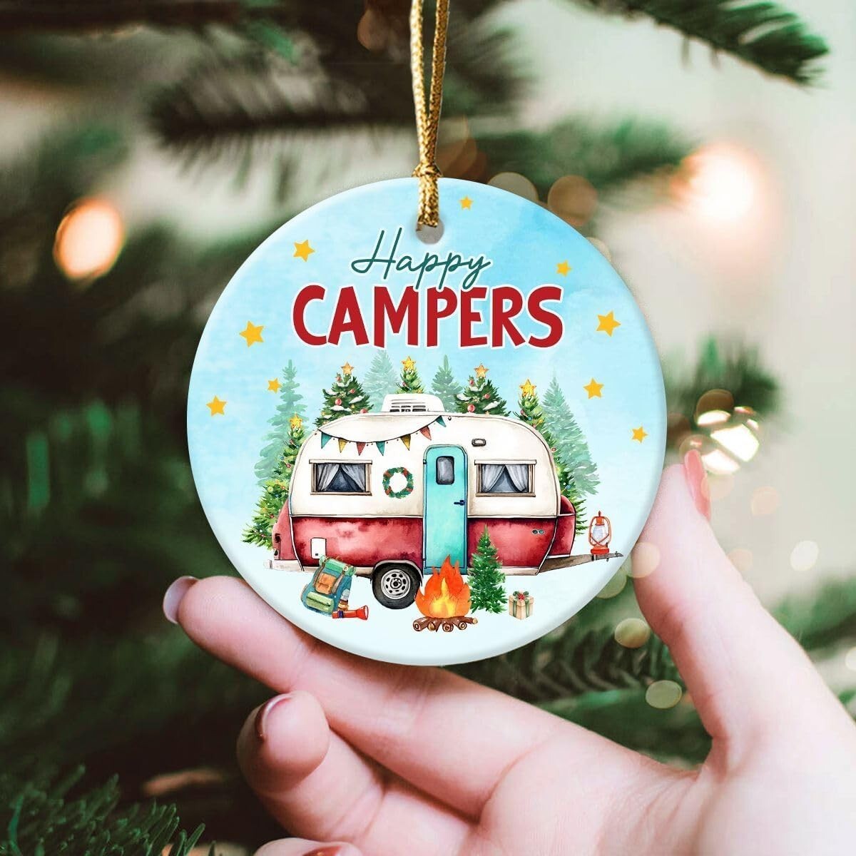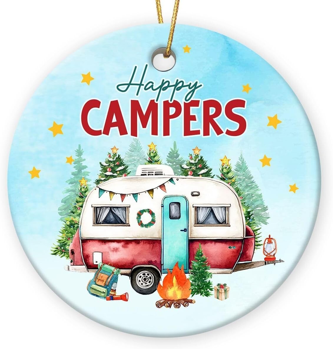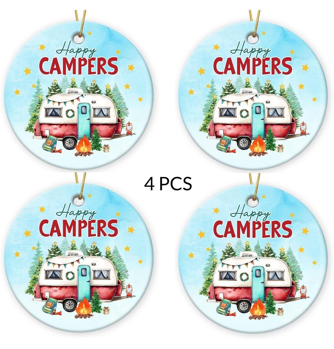 Set of 4 Happy Campers Hanging Ornament Ceramic Decor Travel Gift for Camping Lovers