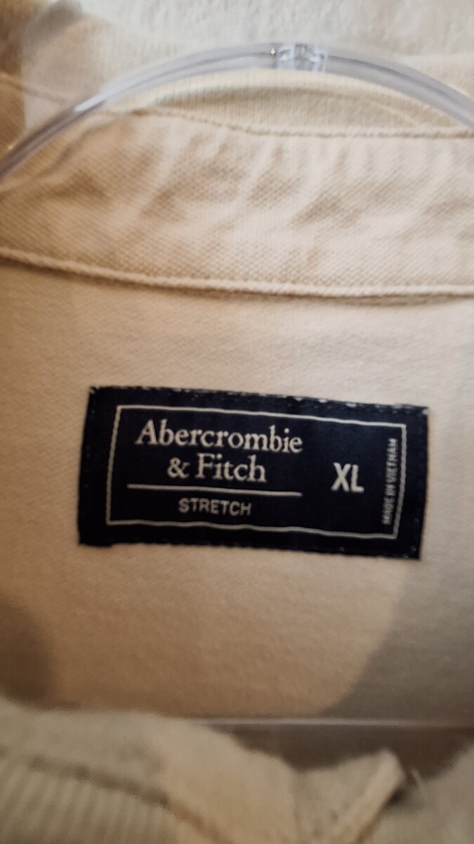 The Abercrombie Fitch Stretch Polo Shirt in Men's XL features a solid light beige color with the brand's signature moose logo accent. This short sleeve polo shirt has a collared neckline and a pullover closure, making it suitable for various occasions including travel, activewear, casual outings, formal events, and workwear. With its stretch fabric, this polo is comfortable and flexible, perfect for everyday wear in any season. The classic design and American heritage theme of this shirt make it a versatile and stylish addition to any man's wardrobe.