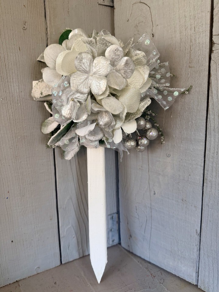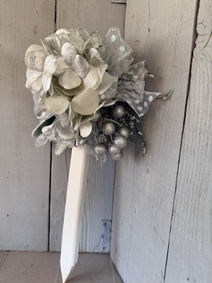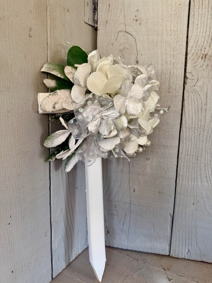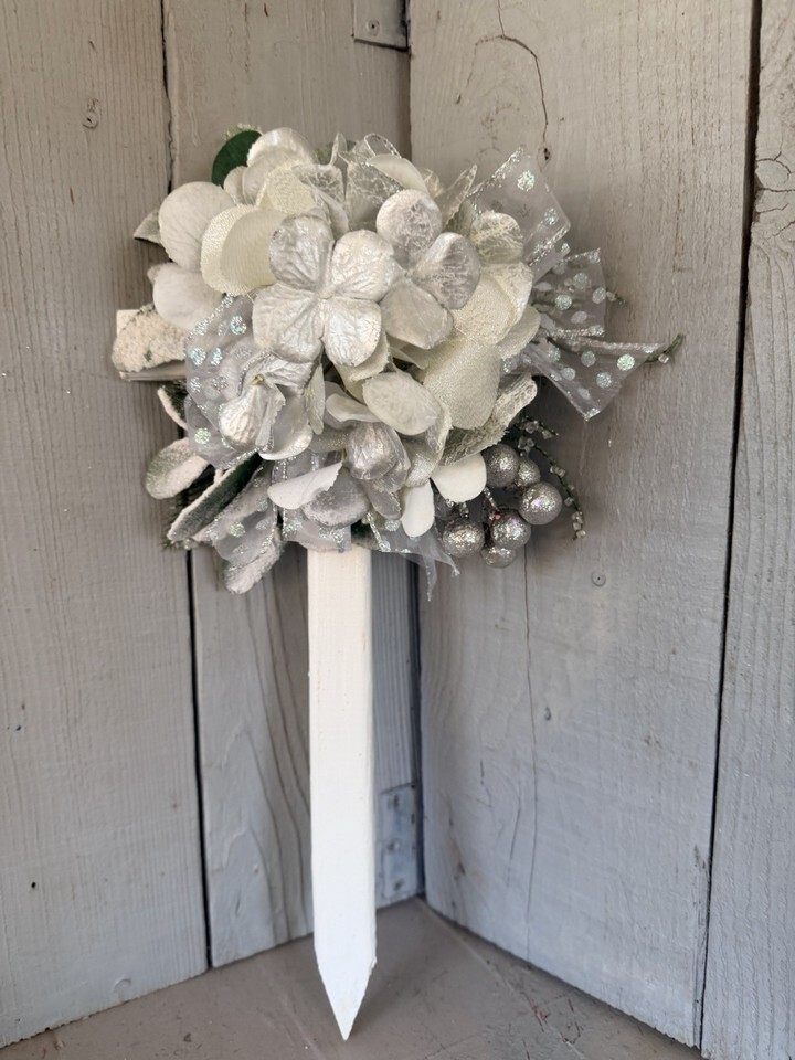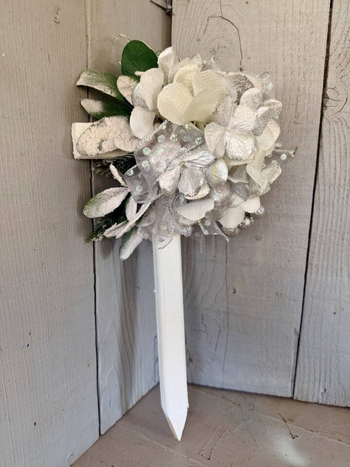 This 18” pine cemetery cross has been painted white with a large metallic hydrangea, fir greenery, snow covered sage leaves, silver glitter berries, silver glitter picks, and silver snowflake ribbon. The cross has a pointed end for easy ground insertion. Every cross is sprayed with a coat of clear polyurethane to protect the ribbon and silk flowers from outdoor elements.