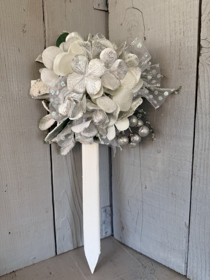Winter Cemetery Cross: Silver Hydrangeas grave flowers, Winter Grave Decor