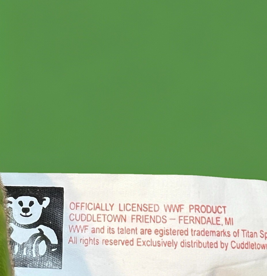 The product is a 14" WWF Ken Shamrock Cuddletown Friends plush toy, officially licensed by WWF. This wrestling-themed plush features Ken Shamrock, a popular wrestler in the sport. The multi-color plush is suitable for unisex children and is made in China. Perfect for fans of wrestling and collectors of sports memorabilia, this adorable cuddly toy is a must-have for any fan of WWF and Ken Shamrock. some wear see photos.