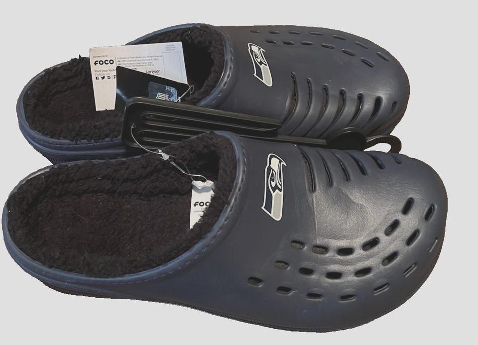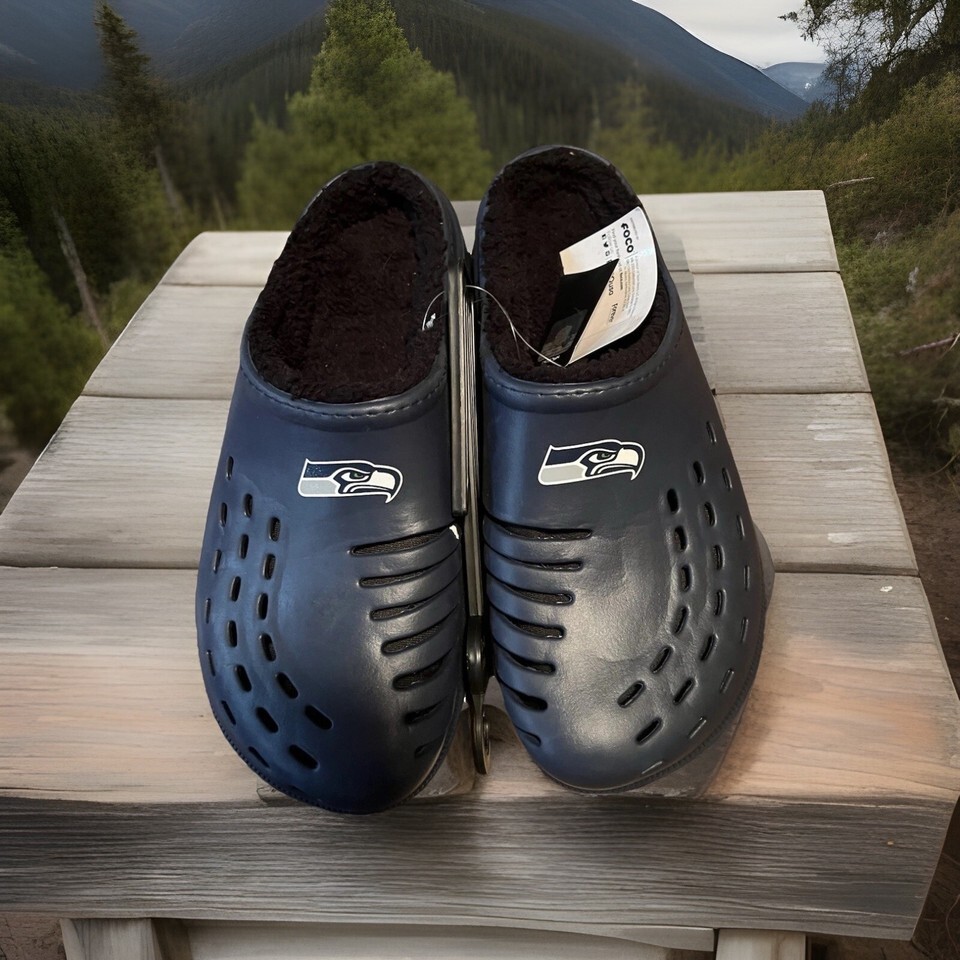 The FOCO NFL Seattle Seahawks fleece fur lined sandals slides in size 11-12 are designed for male football fans who want to show their team spirit in style. These blue sandals feature the Seattle Seahawks logo and are perfect for lounging at home or wearing out in public. With the cozy fleece lining, they provide both comfort and warmth, making them a practical and fashionable choice for any NFL enthusiast.