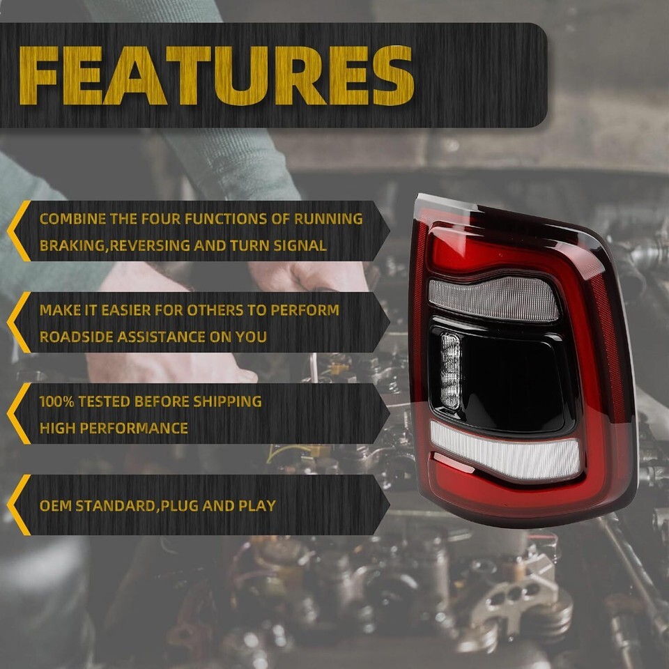 ?Fitment?The tail light Assembly Compatible with 2019-2023 Dodge Ram 2500 3500 (without blind spot) ?Replace?Ram 2500 3500 tail light Assembly Replace# 68361718AD ?Advantage? The taillight is an LED light source, which is brighter and can work perfectly in rainy and foggy weather, thus improving driving safety. ?Features?Dodge Ram 2500 3500 Rear Lamp is OEM Standard ,Made of high quality materials, Waterproof, dustproof, anti-fog and durable.With bulb and wiring harness ,direct installation ?Warranty?Ram 2500 3500 tail light can be returned and exchanged within 30 days with a one-year warranty