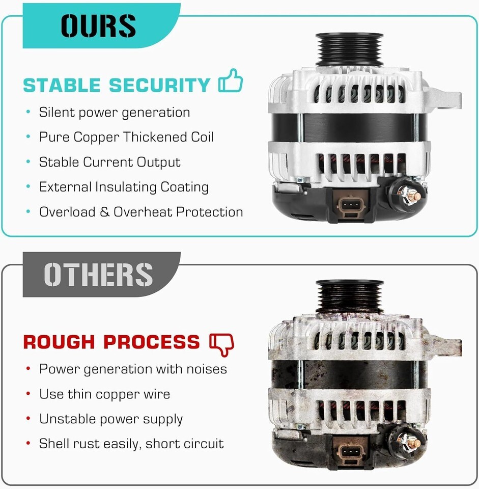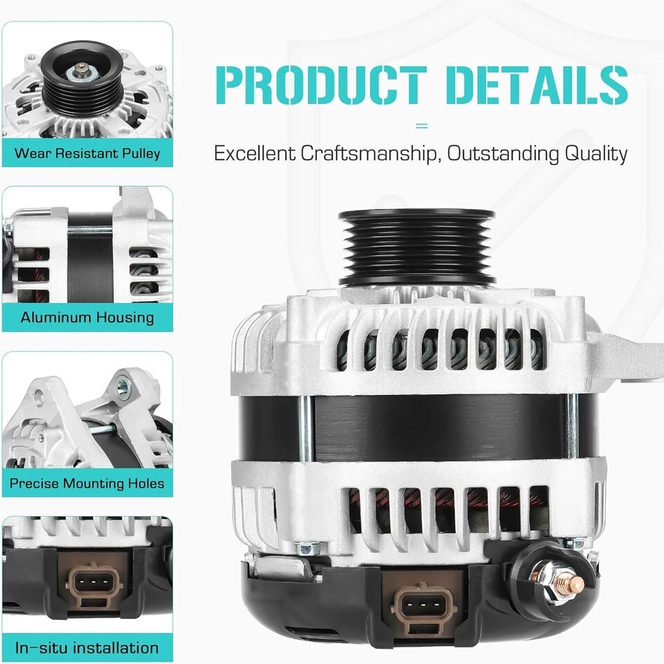?Compatibility?Fit for Ford F-150 3.5L V6 2011, 2012, 2013, 2014;Fit for F-150 3.7L 2011, 2012, 2013, 2014 ?Replaces Numbers?CL3T-10300-BA, CL3Z-10346-B, 11624, GL-8674 ?Strong Power?Aluminum alternator, pure copper thickened coil, strong power, stable power supply. External insulating coating to prevent short circuits, durable and long life ?In-situ Installation?Can be used normally without any debugging and modification. We offer 30 day refund, 1 year free replacement parts ?In-situ Installation?Can be used normally without any debugging and modification. We offer 30 day refund, 1 year free replacement parts