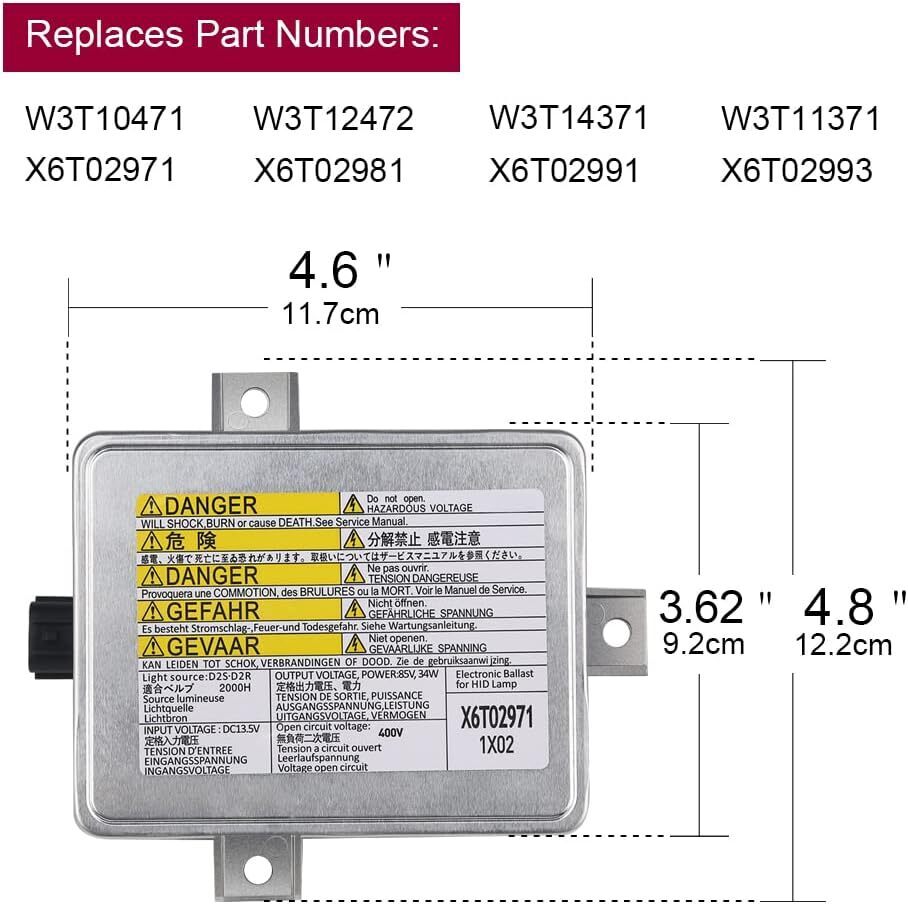 Package Including : 2 PCS Ballast. Replaces Part Numbers W3T10471, W3T12472, W3T14371, W3T11371, X6T02971, X6T02981, X6T02991, X6T02993 Replacement Headlight Ballast - is responsible for supplying power to your headlight's bulb. Every ballast is designed to connect directly to your vehicle and requires NO programming or coding. Compatible with 2002-2005 Acura TL and TL Type-S,2004-2005 Acura TSX,2004-2009 Honda S2000,2004-2006 Mazda 3 Input Voltage is DC 12V not fit 24V, Output Voltage Power AC 85V 34W , Fits D1S D2R left or right headlight bulb. Warranty Service -Ballast comes complete with One Year Warranty Provide Lifetime technical support If the part ever fails, please contact us.