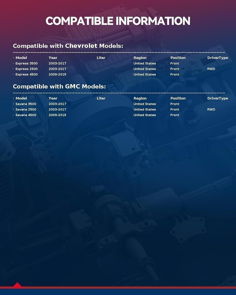 *fits for 2003 Chevry Express 2500 LS , 2003-2005 Chevry Express 2500 Base ,2003-2017 Express 3500