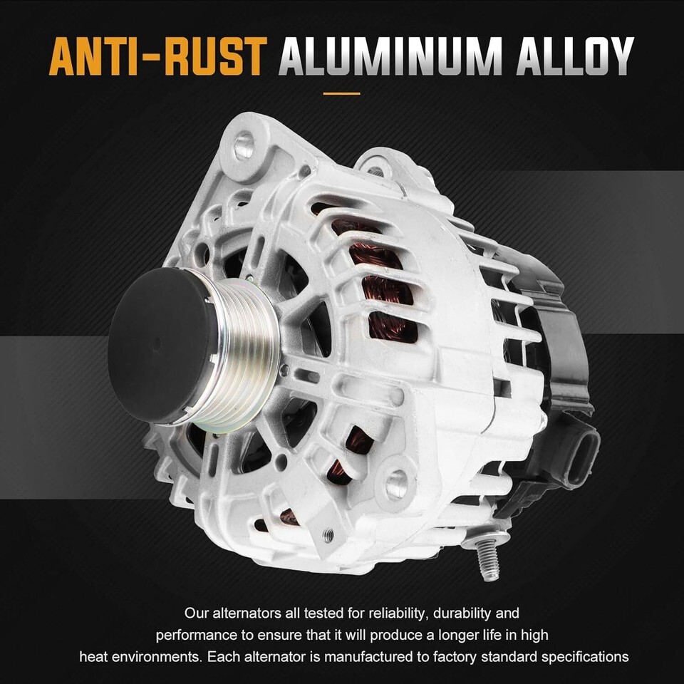 Alternator Compatible with: 2.5L Nissan Sentra 2007-2012, 2.5L Nissan Select 2014-2015, 2.5L Nissan Rogue 2011-2013, 2.5L Nissan Altima 2007-2013. Alternator Specifications: ?Voltage: 12 ?Rotation: CW ?Amperage: 130 ?Clock: 2 ?Pulley Class: SC6 ?Regulator: IR ?Fan Type: IF Alternator Replace for: 23100-JA02A, 23100-JA02B, 23100-JA02C, 23100-JA04A, 23100-JA04C, 23100-JA04D, 2609555A, 2650364 11055, 11258, 11258N, 11458, 15715, 213-9230, 213-9323, 2609555, 2650364A, 2650364B, 400-40102, 50168, 849054, AL-1268, AL-1454, AL-1531. Reliable Quality Assurance: we offers high quality automotive replacement alternators that provide high performance for your car. Our alternators all tested for reliability, durability and performance to ensure that it will produce a longer life in high heat environments. Confident Warranty: we offer one year warranty after you purchase the alternator, if you have any problem, please feel free to contact us. Please make sure the car model and the partnumber before you purchasing.