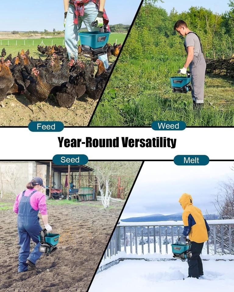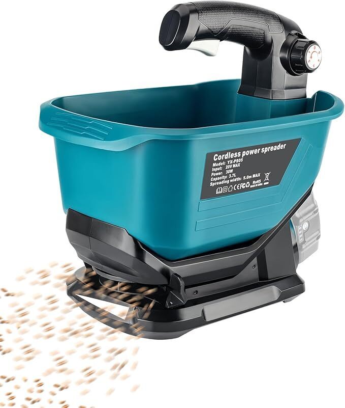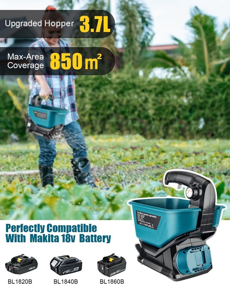 ?Year-Round Versatility?- This handheld seed spreader serves multiple purposes including seeding, fertilizing, spreading salt, melting ice and snow, and dispensing feed, making it a versatile tool for all seasons. ?Lightweight Design?- Compatible with Makita 18v batteries BL1820B BL1830B BL1840B BL1850B BL1860B etc. Weighing just 2.9 pounds, it's easy to carry and handle.(Battery not included) ?Upgraded Hopper?- With a 3.7-liter large capacity hopper, it can cover an area of up to 850 square meters, making it perfect for small yard handheld seeding. ?Precision Seeding?- Featuring 5 seed sowing volume settings, a 125adjustable seeding disc opening, and a black edge dial for protecting non-lawn areas, ensuring precise seeding every time. ?Excellent Service?- Enjoy 24/7 customer service, a one-month no-reason return policy, and a one-year warranty. Adisipsoarin is committed to thoughtful design, high-quality products, and professional and efficient after-sales service.