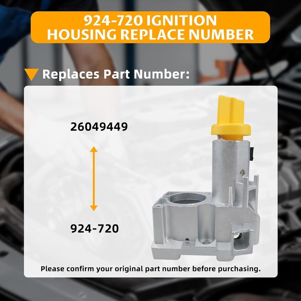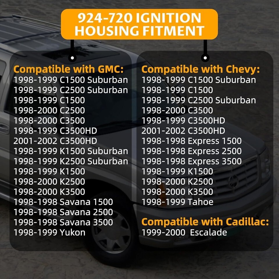 Replaces Part Number: Ignition Assembly replaced for? 26049449, 924-720. Please confirm your original part number before purchasing. Vehicles Fitment-1: 924-720 Ignition Assembly Compatible with 1998-1999 Chevy C1500 Suburban, 1998-1999 Chevy C1500, 1998-1999 Chevy C2500 Suburban, 1998-2000 Chevy C3500, 1998-1999, 2001-2002 Chevy C3500HD, 1998 Chevy Express 1500, 1998 Chevy Express 2500, 1998 Chevy Express 3500, 1998-1999 Chevy K1500, 1998-2000 Chevy K2500, 1998-2000 Chevy K3500, 1998-1999 Chevy Tahoe. Compatible with 1999-2000 Cadillac Escalade. Vehicles Fitment-2: 924-720 Ignition Assembly Compatible with 1998-1999 GMC C1500 Suburban, 1998-1999 GMC C2500 Suburban, 1998-1999 GMC C1500, 1998-2000 GMC C2500, 1998-2000 GMC C3500, 1998-1999, 2001-2002 GMC C3500HD, 1998-1999 GMC K1500 Suburban, 1998-1999 GMC K2500 Suburban, 1998-1999 GMC K1500, 1998-2000 GMC K2500, 1998-2000 GMC K3500, 1998 GMC Savana 1500, 1998 GMC Savana 2500, 1998 GMC Savana 3500, 1998-1999 GMC Yukon. Perfect Replacement: When your vehicle has problems such as failure to ignite or extinguish the fire, it is time to replace the ignition lock cylinder assembly. This ignition assembly has been modified and tested many times to ensure that it is perfectly adapted to your car, precisely designed and perfectly fitted. Package Include: 1* Ignition Lock Housing.