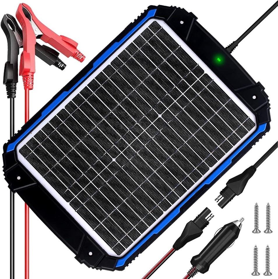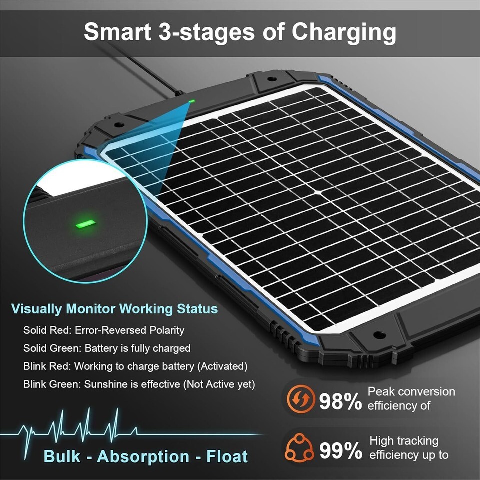 ??Portable Charge Anywhere?- Lightweight and portable solar charger. Transfer sunshine into electricity, charge and maintain different 12V battery such as flooded, gel, AGM, SLA, VRLA, lithium-ion battery of RV, car, boat, marine, automotive, snowmobiles, etc. in all seasons. US PATENT PENDING! ??Intelligent Charge Maintain?- Fully protect the battery! Built-in intelligent MPPT controller, generates at least 20%-30% more power than the other controller. Smart 3-stages charging algorithm effectively prevents the battery from over-charge, over-voltage, discharge, short circuit, etc. ??Upgraded Visual Monitor?- The colorful LED indicator helps to visually monitor working status of the charging. Charging will be cut off automatically when battery is fully charge, and resumed when battery goes flat, totally free maintenance. ??Waterproof Hign quality Materials?- Use 30% high conversion efficiency crystalline silicon material + high-strength solar energy glass which has 95% strong light transmittance and waterproof performance, can withstand harsh weather conditions. ??Free Maintenance?- Tempered glass and strong ABS frame, well built for years. Come with 3-piece SAE cable kits, plug and play, easy to use. No electricity cost, free maintenance for outdoor usage. Backed by extended 12 months warranty + lifetime technical supports.