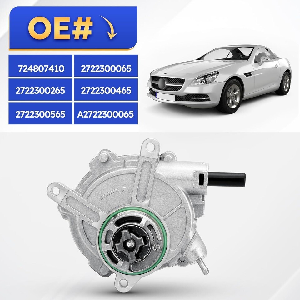 ?Compatible with Mercedes-Benz models: 2006-2007 C230 W203 V6 2.5L?2006-2007 C280 W203 V6 3.0L?2008-2011 C300 W204 V6 3.0L?2006-2011 C350 W203/W204 V6 3.5L?2006-2011 E350 W212/C207 V6 3.5L Fuel: GAS?2006-2011 ML350 W164 V6 3.5L Fuel: GAS?2006-2011 R350 W251 V6 3.5L Fuel: GAS?2006-2008 SLK280 R171 V6 3.0L?2009-2011 SLK300 R171/ R172 V6 3.0L. Please check the second main picture to confirm brake booster vacuum pump whether compatible with your car. ?Excellent Function: The vacuum pump provides a vacuum to the booster on power brake, ensure that the booster stays under constant vacuum and provide adequate braking force. To prevent the effects of engine blow-by, undergoes 100% pressure testing to prevent leaks and ensure OE-matching performance. ?High-quality:The brake vacuum pump made of high quality material for high precision and durability,ensure long time to use, high-quality seals prevent leaks and maintain proper vacuum pressure. ?OE#2722300065. Replace OE# 724807410, 2722300065, 2722300265, 2722300465, 2722300565, A2722300065.Package included: 2722300065 Vacuum Pump x1. Not included instruction manual. Easy to install. ?After-Sales Service: We offer 24 hours customer service and 1 year product service, If you are encounter product installation, product quality and other problems, please feel free to contact us.