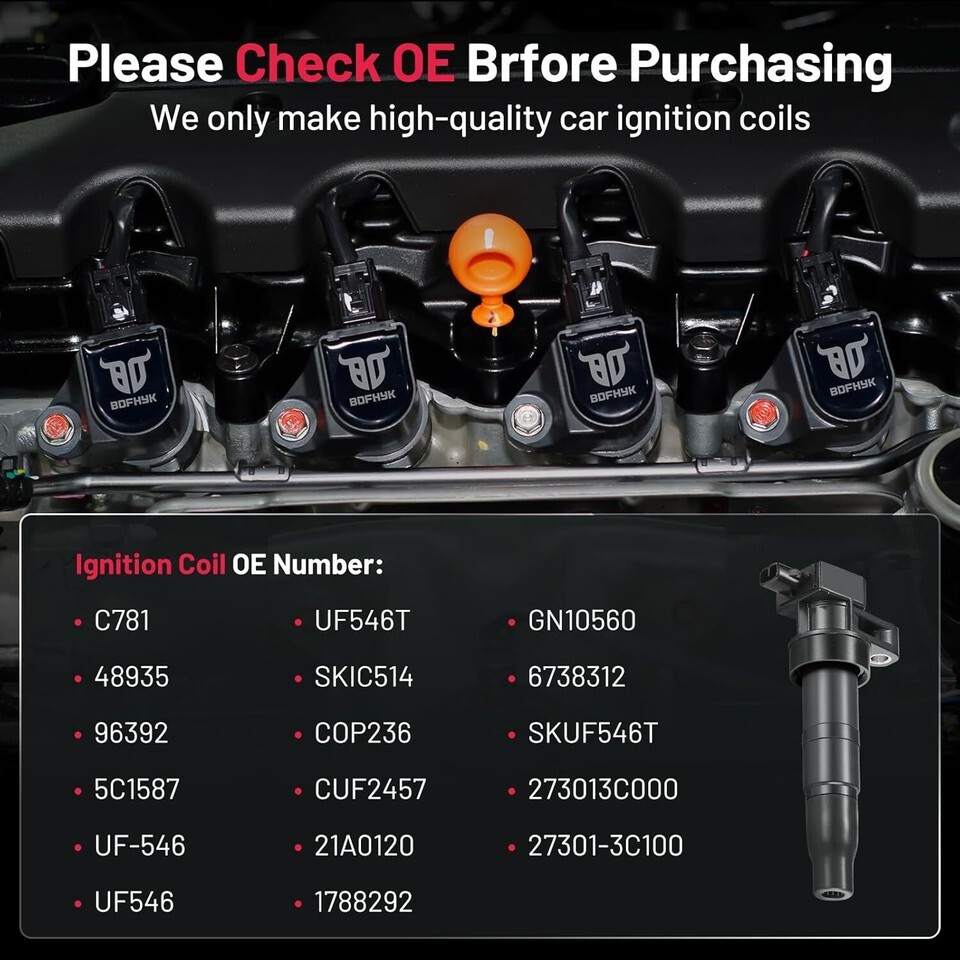 REDUCES COMMON IGNITION COIL ISSUES- such as; no/hard start, long crank time, misfires, lack of power, inconsistent transmission shifts, spark plug fouling, premature catalytic converter failure, poor fuel economy, check engine light illumination DIRECT REPLACEMENT/ UPGRADE - Over your original stock coils. We only use the highest grade materials. This makes our product durable and reliable under extreme conditions while providing High Electrical Resistance, strong Spark from plugs, and being resistant to Corrosion and Abrasion COMPATIBLE PART NUMBERS - 27301-3C000, 27301-3C010, 27301-3C100, 273013C000, 273013C010, 273013C100, UF-546, UF546, UF546T, SKIC514, C781, CUF2457, COP236, 5C1587, 96392, GN10560, 21A0120, 1788292, 48935, 6738312, SKUF546T HIGH QUALITY - ISO/TS 16949 QUALIFIED - Our ignition coil are tested and meet or exceed OEM performance requirements,buy BDFHYK ignition coil can save over $50-$102 in US auto parts store COMPATIBLE WITH - 2019 Hyundai Santa Fe XL,2010-2018 Hyundai Santa Fe,2006-2017 Hyundai Azera,2015-2017 Kia K900,2014-2017 Kia Sedona,2011-2017 Kia Sorento,2009-2016 Hyundai Genesis,2010-2016 Hyundai Genesis Coupe,2014-2015 Kia Cadenza,2007-2012 Hyundai Veracruz,2009-2011 Kia Borrego,2006-2010 Hyundai Sonata,2007-2009 Kia Amanti,2007-2008 Hyundai Entourage,2006-2008 Kia Optima,2007 Kia Magentis,2013-2014 Hyundai Santa Fe XL.More information can be found in the pictures or on the details page.