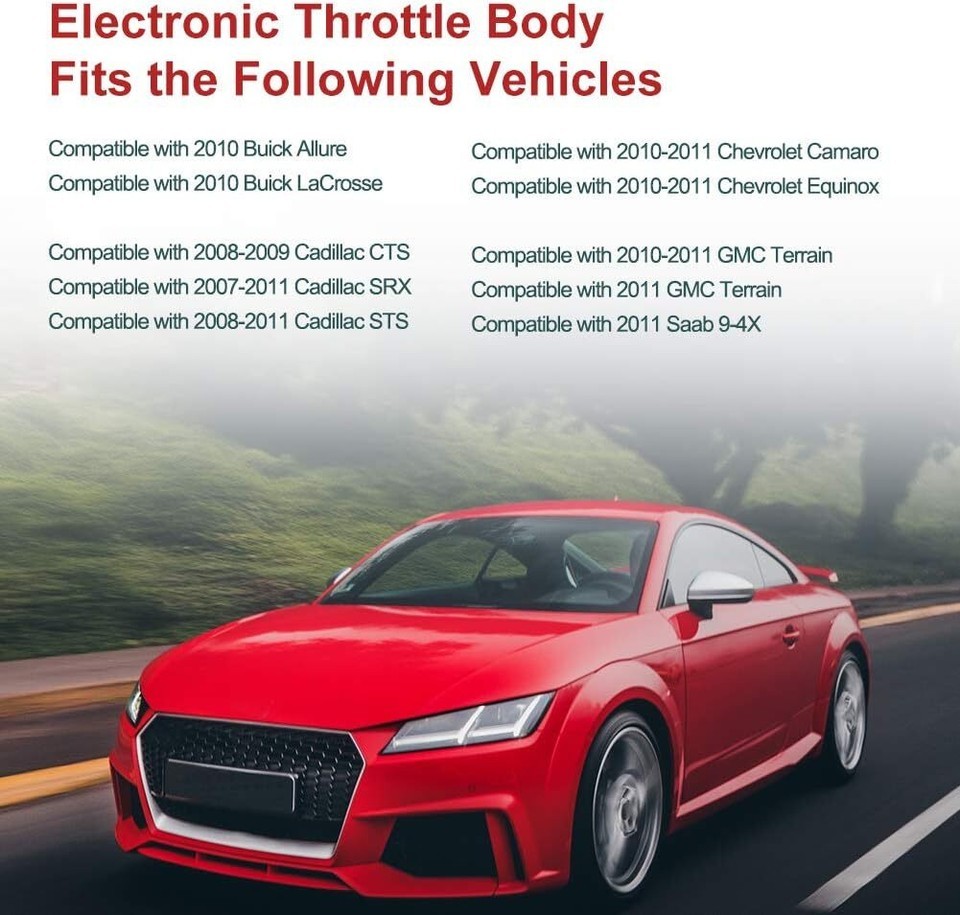 ?OEM Part Number?: Electronic throttle body replacement for 977-314, 67-3019, S20018, TB1044, 12604075, 12609009, 12616994, 12694878, 12634371 ?Fitment?: Throttle body assembely compatible with 2010 Buick Allure LaCrosse, compatible with Cadillac CTS SRX STS, compatible with Chevy Camaro Equinox 2010-2011, compatible with GMC Terrain 2010-2011 ?Reliable Material?: The throttle body is made of durable aluminum material. High temperature and corrosion resistance, suitable for long-term use. Before installation, it is necessary to clean the pipeline connecting the car and throttle valve, especially for old cars, otherwise it may not work or work smoothly ?Stable Performance?: The throttle sensor can monitor real-time changes in the throttle valve and quickly transmit data, enabling the engine control system to quickly adjust and provide faster and smoother acceleration response. The throttle body can more accurately control the amount of air flowing into the engine, ensuring optimal engine performance and improving vehicle performance and efficiency ?Direct Replacement?: If the vehicle encounters situations such as inability to start, engine shutdown, unstable idle, insufficient power, electronic throttle warning light on, hesitation, or power surge during acceleration, the throttle body needs to be replaced in a timely manner. Suggest professional installation