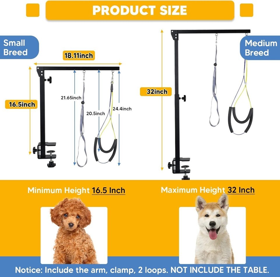 POWERFUL METAL CLAMP:Our clamp can be opened up to 2.16",fit on most dog grooming stand or tables.This metal clamp is made of heavy-duty thick steel,and the clamp adds a non-slip pad to increase grip and better hold the clamp firmly on your dog grooming table to avoid shaking during treatment,and also effectively protects your table from damage.The knob of the clip allows for easy and convenient installation and removal of this dog grooming rope and clip,no tools,no drilling required. ADJUSTABLE AND FOLDABLE GROOMING ARM:Adjustable design allows the Duckygoo dog grooming arm to extend from 16.5" to a maximum of 32".The clamp knob is simple to operate to adjust the height,so you can easily find a comfortable height for your pet.Recommended for small and medium sized pets.This dog grooming stand has a foldable grooming arm for easy portability and storage.Note:This product includes the arm,arm extension,clamp,looped cord and 2 no-sit hump stands.Table is not included. STAINLESS STEEL CORROSION-RESISTANT COATING:Pet grooming arm with clamp is made of heavy-duty stainless steel, the surface has an anti-corrosion coating to maintain a new appearance even after long use, strong load-bearing, durable, not easy to break, rust, corrosion. The stainless steel surface is very smooth and free of burrs, avoiding pets from being scratched. Dog grooming ring is also made of high quality steel wire material, bite resistant, sturdy and durable. 3 ADJUSTABLE ROPES EFFECTIVE PROTECTION FOR PETS IN CARE:Professional pet groomers or pet owner,can use the dog grooming arm and dog restraint leashes to safely hold the dog's head and waist in place.Both the haunch holder and dog grooming harness adopt adjustable metal rings,which can quickly adjust the right size,preventing the dog from falling out of the noose.Ideal solution for keeping dogs standing comfortably during dog care and helps control excessive movement of an excited pet. MULTI-SCENE USE GOOD CUSTOMER SERVICE:The grooming table arm is suitable for small and medium-sized dogs and can be used at home for bathing, blow-drying, haircutting, nail clipping, etc. Duckygoo is committed to providing a convenient and comfortable life for every family with pets, if you have any questions, you can always contact us and we will be the first to serve you.