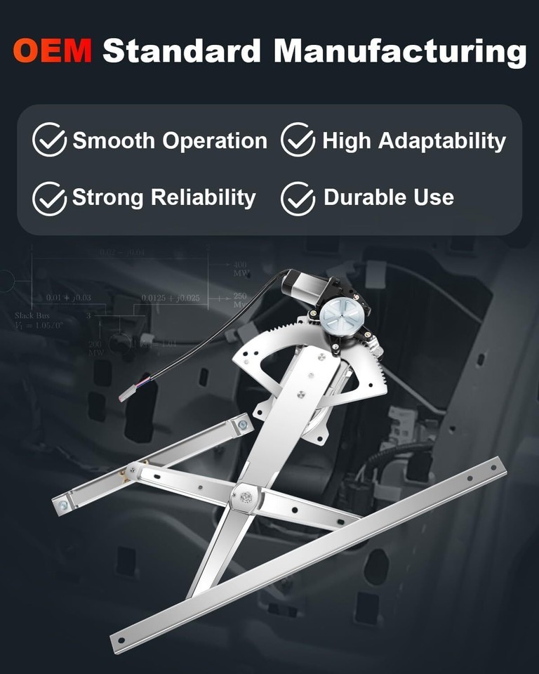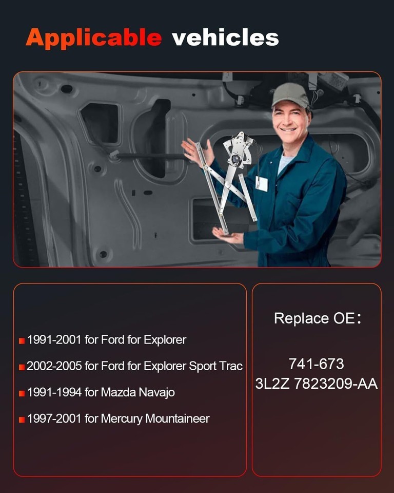 SUITABLE VEHICLE- The Power Window Regulator Fit For 1991 1992 1993 1994 1995 1996 1997 1998 1999 2000 2001 for Ford for Explorer,2002 2003 2004 2005 for Ford for Explorer Sport Trac,1991-1994 for Mazda Navajo,1997-2001 for Mercury Mountaineer FEATURES- OEM: 741-673,3L2Z 7823209-AA.This Window Regulator is manufactured to OEM standards and fits the original model. QUALITY ASPECT- This window lifter has been evaluated thousands of times in actual car doors to verify its performance durability under cyclic loads, smooth lifting operation, and long-term durability. DIRECTLY INSTALLATION- The Power Window Regulator plug and play, the installation hole is exactly the same as the original car, easy to install. NOTE- When purchasing this power window regulator, please confirm whether the year, model, and other information of your vehicle match the product information.