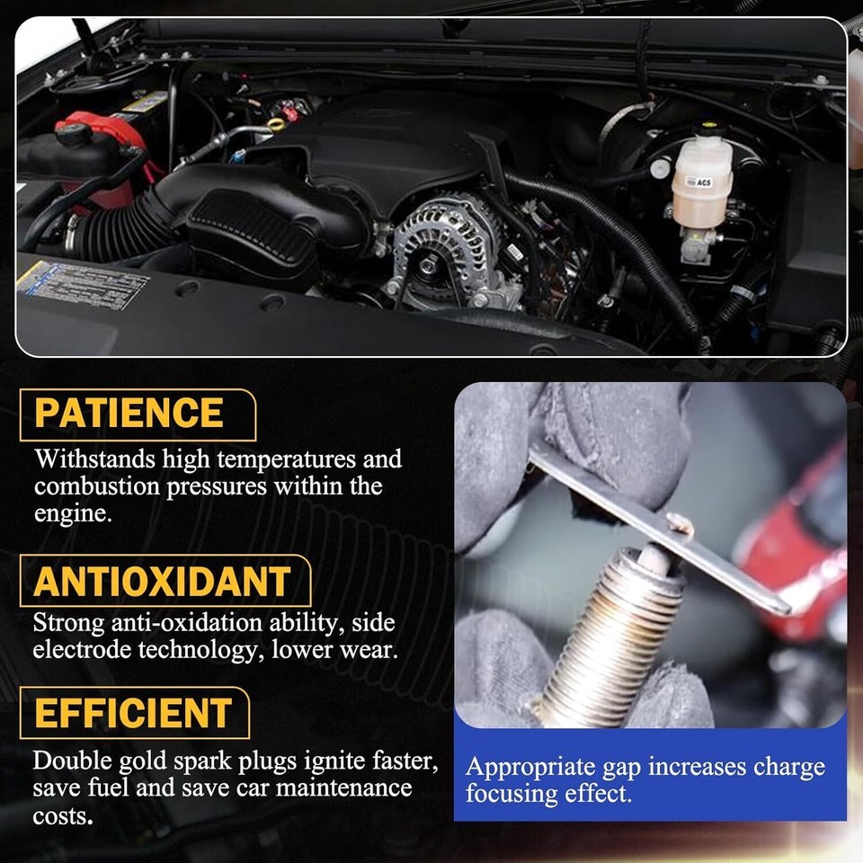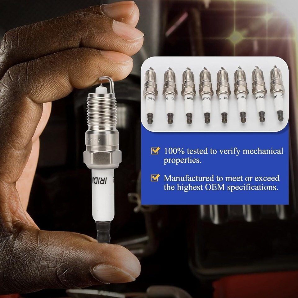 ?For Chevy: 99-10 Silverado 1500?01-06 Silverado 1500 HD?01-12 Silverado 2500 HD?01-19 Silverado 3500 HD?00-14 Suburban 1500?00-10 Suburban 2500?03-14 Express 1500?03-17 Express 2500 4.8L?03-05 Express 2500 5.3L?03-16 Express 3500 4.8L?03-08 Express 3500 5.3L?97-04 Corvette?00-10 Tahoe?06-08 Impala?02-06 Avalanche 1500?03-06 SSR/Trailblazer EXT.For GMC: 99-10 Sierra 1500?99-06 Sierra 2500?01-12 Sierra 2500 HD?07-12 Sierra 3500 HD?09-10 Savana 1500?03-16 Savana 2500/3500?02-10 Yukon?04-09 Envoy?03-06 Envoy XL. ?Compatible with: For Cadillac: 02-05 Escalade 5.3L?02-12 Escalade 6.0L?07-12 Escalade 6.2L?03-09 Escalade EXT 6.0L/6.2L?04-11 Escalade ESV 6.0L/6.2L?04-07 CTS 5.7L/6.0L. For 03-05 Isuzu Ascender?03-17 Isuzu NPR?03-09 Hummer H2?08-10 Hummer H3?11-12 VPG MV-1. For 04-07 Buick Rainier?08-09 Buick Allure/LaCrosse?05 07 Saab 9-7x?06-08 Pontiac Grand Prix. ?Excellent Function: A faulty spark plug may result in vehicle idling and shaking, accelerates weakly. Every component either matches or improves on the OE design to ensure fast and easy installation with superior performance and reliability. to provide superior cold-start performance and a smoother running engine. ?High-quality: The spark plug is double iridium spark plug, have a much longer working life, can work 100000 kilometers, consistent and stable spark. Iridium center electrode firing pin provides exceptional ignitability, faster starts and quicker acceleration, better fuel economy and lower emissions. ?OE# 41-962. Replace Oe# 19238470, 19250977, 88901011, 41-805, 8251616770, 8251657150, AP5245. Package included: Double Iridium Spark Plug x8. Not included instruction manual, easy to install. ?After-Sales Service: We offer 24 hours customer service and 1 year product service, If you are encounter product installation, product quality and other problems, please feel free to contact us.