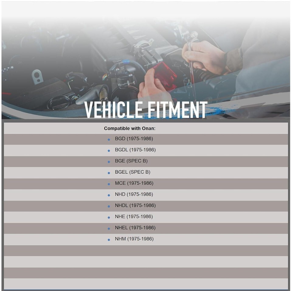 REPLACEMENT FOR or COMPATIBLE WITH ONAN: NHM 75-86 NHEL 75-86 NHE 75-86 NHDL 75-86 NHD 75-86 MCE 75-86 BGEL (SPEC B) multiple years BGE (SPEC B) multiple years BGDL 75-86 BGD 75-86 Replacement For OE#: 191-1630, 191-1667, 191-2132, 191-2158, 191-2418, 6019440, 6091740, 6019440-M030SM, 6019440MO30SM, 6091740MO30SM, SM60194, SM60917