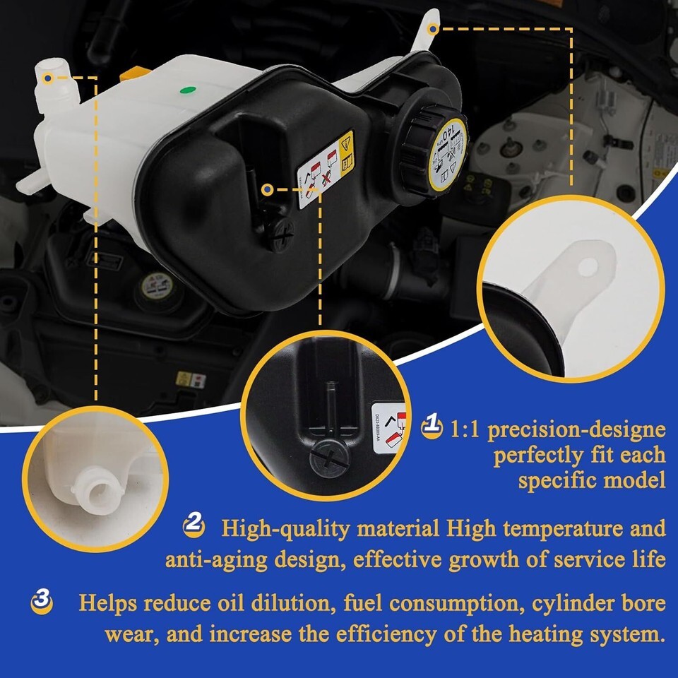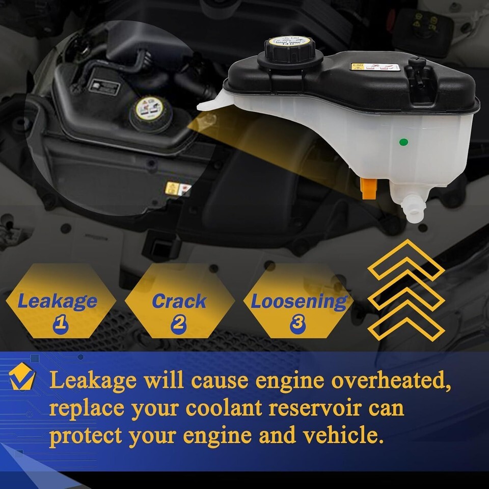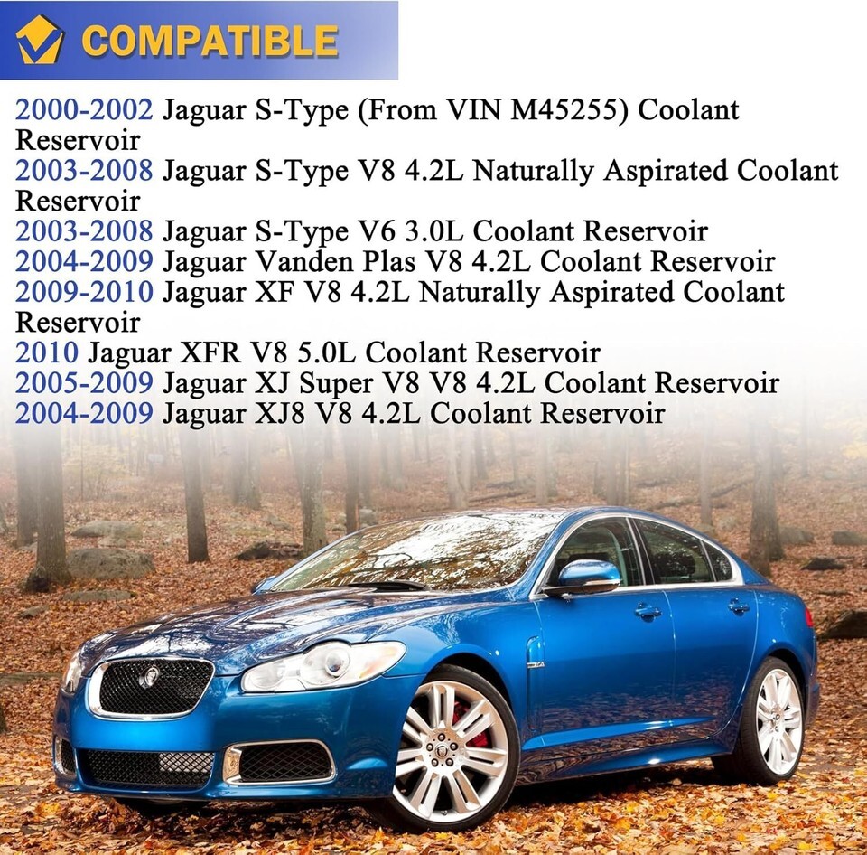 ?OE#603-664. Replace OE#V410032, C2C34557, C2C39438, C2C41899, C2P17700, C2Z13764, XR818921, XR839081, XR847956, XR852096. Compatible with: For Jaguar: 2000-02 S-Type From VIN M45255?2003-08 S-Type V8 4.2L?2003-08 S-Type V6 3.0L?2004-09 Vanden Plas V8 4.2L?2009-10 XF V8 4.2L?2005-09 XJ Super V8 V8 4.2L?2004-09 XJ8 V8 4.2L. Please check the second main picture to confirm coolant reservoir and engine liter whether compatible with your car. ?Function: The coolant tank contains coolant fluid that is discharged from the cooling system attached to the engine. Pressure builds up and released when the coolant is hot and expanding through the radiator and when the engine cools down, the excess fluid flows back into the radiator from the coolant tank of your vehicle. If you are experiencing leaks, low level of coolant and overheating engine then you may have a problem with your coolant reservoir tank. ?High-quality: The coolant reservoir expansion recovery tank with cap is made from high quality plastic materials can withstand excessive heat and vibration, light and durable. While this is not a genuine OEM part, it is a direct replacement and good value. ?Package Included: 1x coolant reservoir + 1x surge cap. (Notice: instruction is not included. Recommended you install under the guidance of professionals.) ?After-Sales Service: We offer 24 hours customer service and 1 year product service, If you are encounter product installation, product quality and other problems, please feel free to contact us.