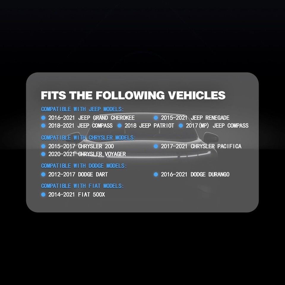 ?Perfect Replacement?The tire pressure monitor system (TPMS) is new.Compatible with Chrylser 200 Pacifica Voyager/Dodge Dart Durango/Jeep Grand Cherokee Compass Partiot Renegade/Fiat 500X(see picture for specific model). Please scroll down to product description for complete list of model and year ?OEM Part Number?68313387AB, 68193586AC, 68252493AB, our sensors are made to the same high standards as your original equipment ?High Quanlity?This tire pressure sensor is manufactured to exacting OE standards to ensure reliable performance and durability, it is constructed of high quality material, premium chip and durable lithium battery, every component has undergone extensive professional testing?including signal, operational temperature, thermal shock, humidity, and proof pressure to ensure trouble-free installation and excellent performance ?Easy to Install?POHILA TPMS is pre-programmed, do not need to programmed again. And the tire sensors are manufactured to OEM specification, it is very easy to install. After installation, you just need to activate them with scan tool ?Service?1 year warranty. All POHILA tire pressure monitoring systems (TPMS) have been extensively tested during manufacturing to guarantee quality.Do not hesitate to contact us if you have any doubts or queries