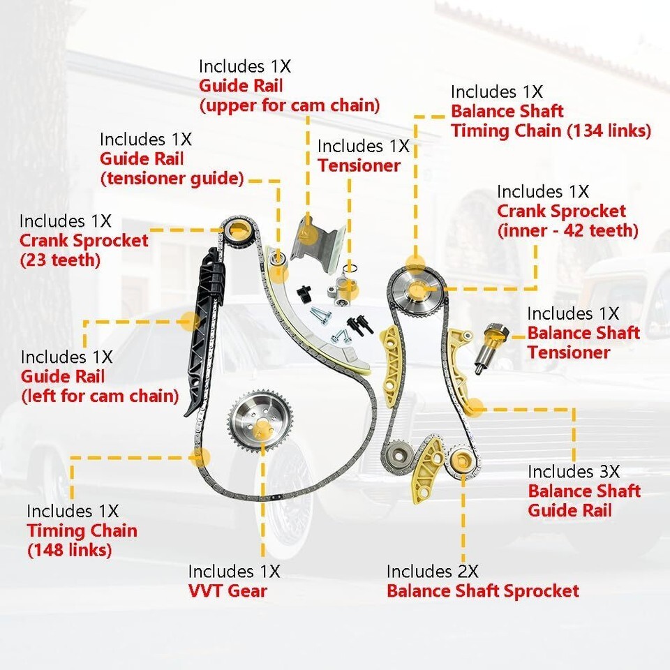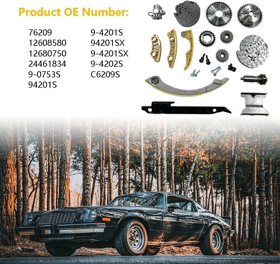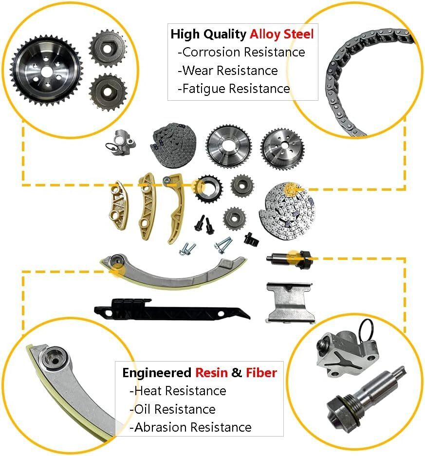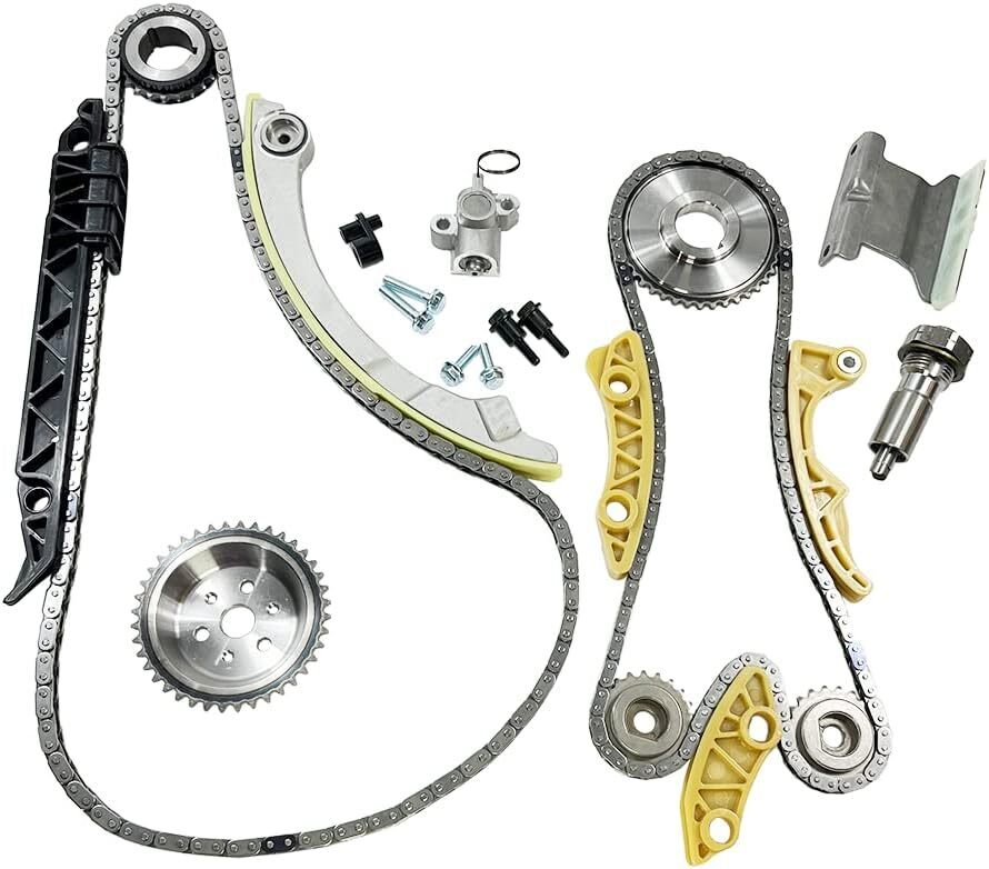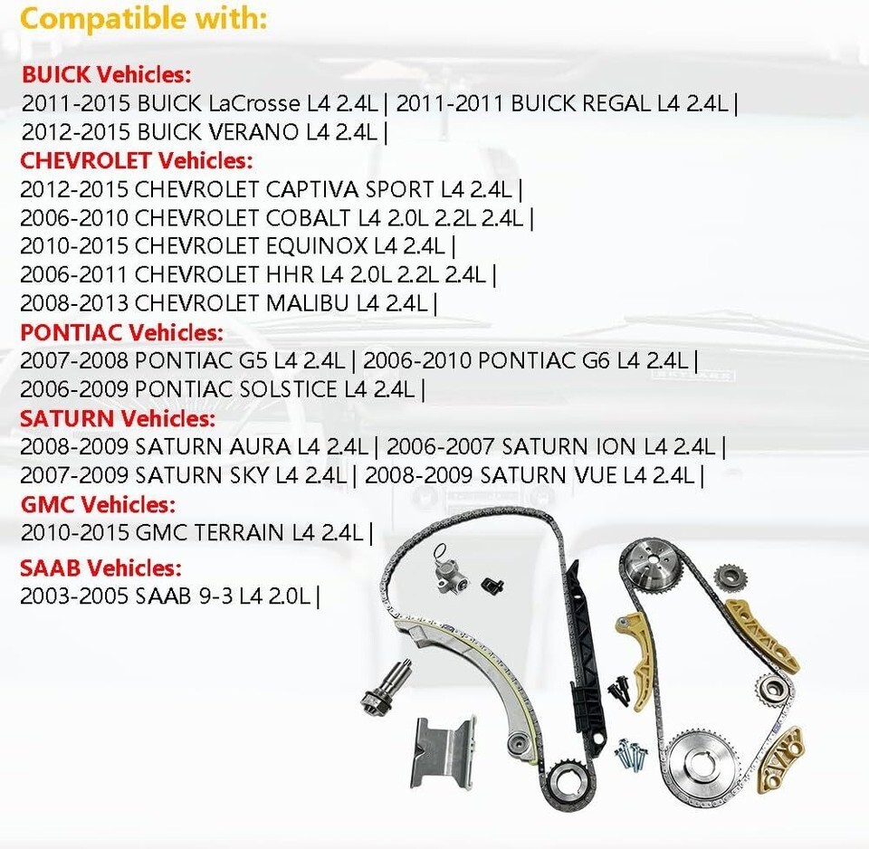 OEM number: 76209 | 12608580 | 12680750 | 24461834 | 9-0753S | 94201S | 9-4201S | 94201SX | 9-4201SX | 9-4202S | C6209S | Package includes: | 1 Timing Chain (148 links) | 1 Crank Sprocket (23 teeth) | 1 VVT Gear | 1 Guide Rail (tensioner guide) | 1 Guide Rail (left for cam chain) | 1 Guide Rail (upper for cam chain) | 1 Tensioner | 1 Balance Shaft Timing Chain (134 links) | 1 Crank Sprocket (inner - 42 teeth) |1 Balance Shaft Sprocket (intake) | 1 Balance Shaft Sprocket (exhaust) | 1 Balance Shaft Guide Rail (upper) | 1 Balance Shaft Guide Rail (left) | 1 Balance Shaft Guide Rail (right) | 1 Balance Shaft Tensioner | Compatible with 2011-2015 BUICK LaCrosse L4 2.4L | 2011-2011 BUICK REGAL L4 2.4L | 2012-2015 BUICK VERANO L4 2.4L | 2012-2015 CHEVROLET CAPTIVA SPORT L4 2.4L | 2006-2010 CHEVROLET COBALT L4 2.0L 2.2L 2.4L | 2010-2015 CHEVROLET EQUINOX L4 2.4L | 2006-2011 CHEVROLET HHR L4 2.0L 2.2L 2.4L | 2008-2013 CHEVROLET MALIBU L4 2.4L | 2007-2008 PONTIAC G5 L4 2.4L | 2006-2010 PONTIAC G6 L4 2.4L | 2006-2009 PONTIAC SOLSTICE L4 2.4L | 2008-2009 SATURN AURA L4 2.4L | 2006-2007 SATURN ION L4 2.4L | 2007-2009 SATURN SKY L4 2.4L | 2008-2009 SATURN VUE L4 2.4L | 2010-2015 GMC TERRAIN L4 2.4L | 2003-2005 SAAB 9-3 L4 2.0L |