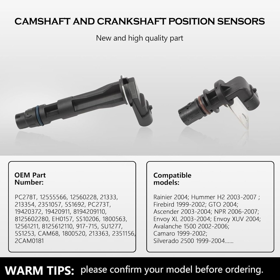 ?Compatibility?: Avalanche 1500 2002-2006, Camaro 1999-2002, Corvette 1999-2004, Express 1500/2500/3500 2003-2007, Silverado 1500 1999-2007, Silverado 2500 1999-2006, Silverado 3500 2001-2007, SSR 2003-2004, Suburban 1500/2500 2000-2006, Tahoe 2000-2006, Trailblazer 2003-2004. ?Compatibility?: Escalade 2002-2006, Rainier 2004-2004. ?Compatibility?: Envoy 2003-2004, Savana 1500/2500/3500 2003-2007, Sierra 1500 2001-2007, Sierra 2500 1999-2006, Sierra 3500 2001-2007, Yukon 2000-2006. ?OE number?: 213354,12555566, 12560228, 8125602280, PC278T, PC273, PC278, PC273T, 19420372, 19420911, 8194209110, 8125602280,12555566, 12560228,1800520, 213363, 2351156, 2CAM0181, 5S1253, CAM68, SU1277. [Note]: Before purchasing, please check whether your car model and original part number are consistent with our products. If you have any questions, we will provide you with services at any time!