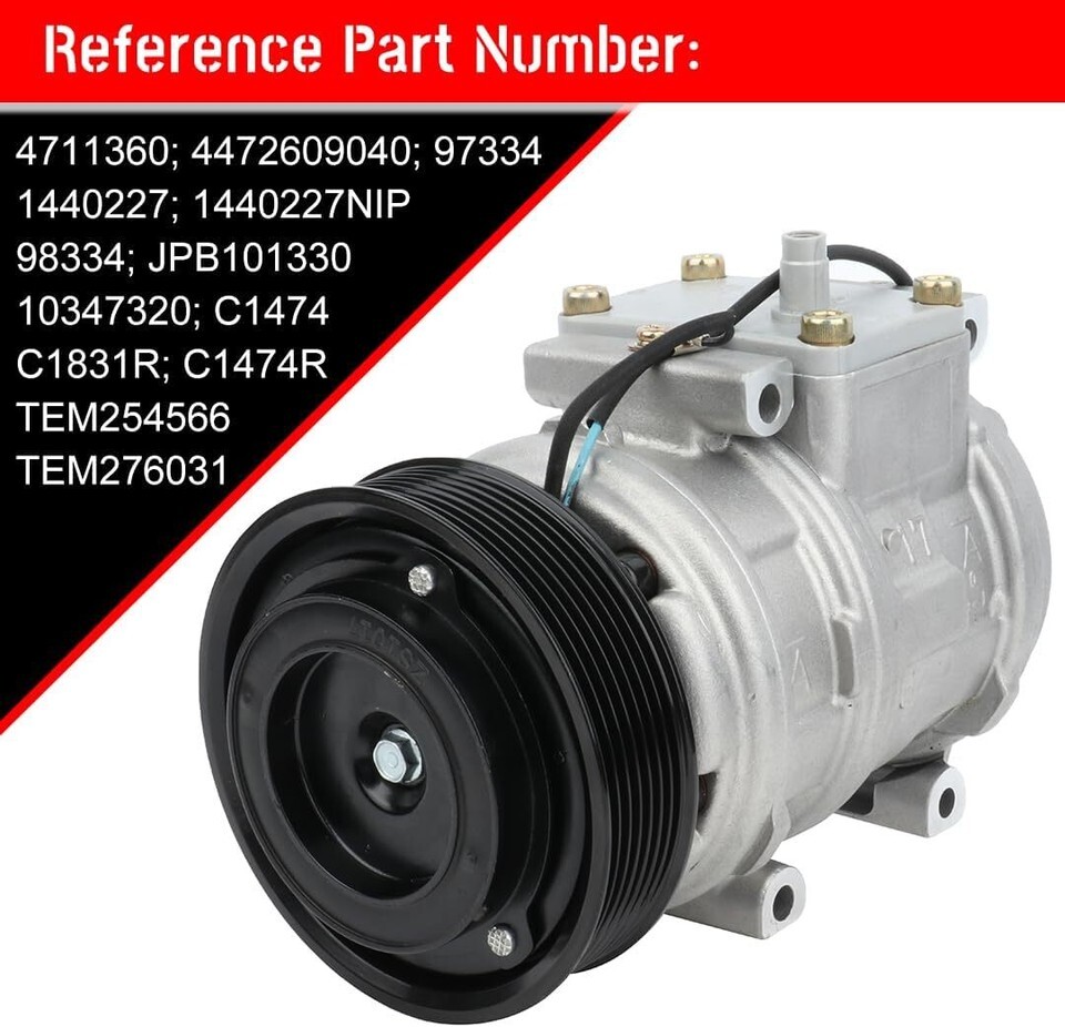 High Performance and Easy to Install: Air conditioner compressor pump is leak-free, 100% OEM standard, fast cooling, low noise, easy to install Vehicle Fitment: 1999-2002 Fit for Land Rover for Discovery 4.0L, 2003-2004 Fit for Land Rover for Discovery 4.6L, 1999-2000 Fit for Land Rover for Range Rover 4.0L, 2003 Fit for Land Rover for Range Rover 4.4L, 1999-2002 Fit for Land Rover for Range Rover 4.6L If you are experiencing loud or unusual noises, leaks around the A/C unit, reduced air blowing, or your A/C system is sending warm air instead of cold air, you may have a problem with your A/C compressor unit Parameter Information: Compressor Type:10PA17C; Oil Type:PAG 46; R-efrigerant Type: R-134A; Pulley Grooves:7; Clutch Included: Yes; Pulley Diameter (mm):119 Part Number: 4711360; 4472609040; 97334; 98334; JPB101330; 1440227; 1440227NIP; 10347320; C1474; C1831R; C1474R; TEM254566; TEM276031