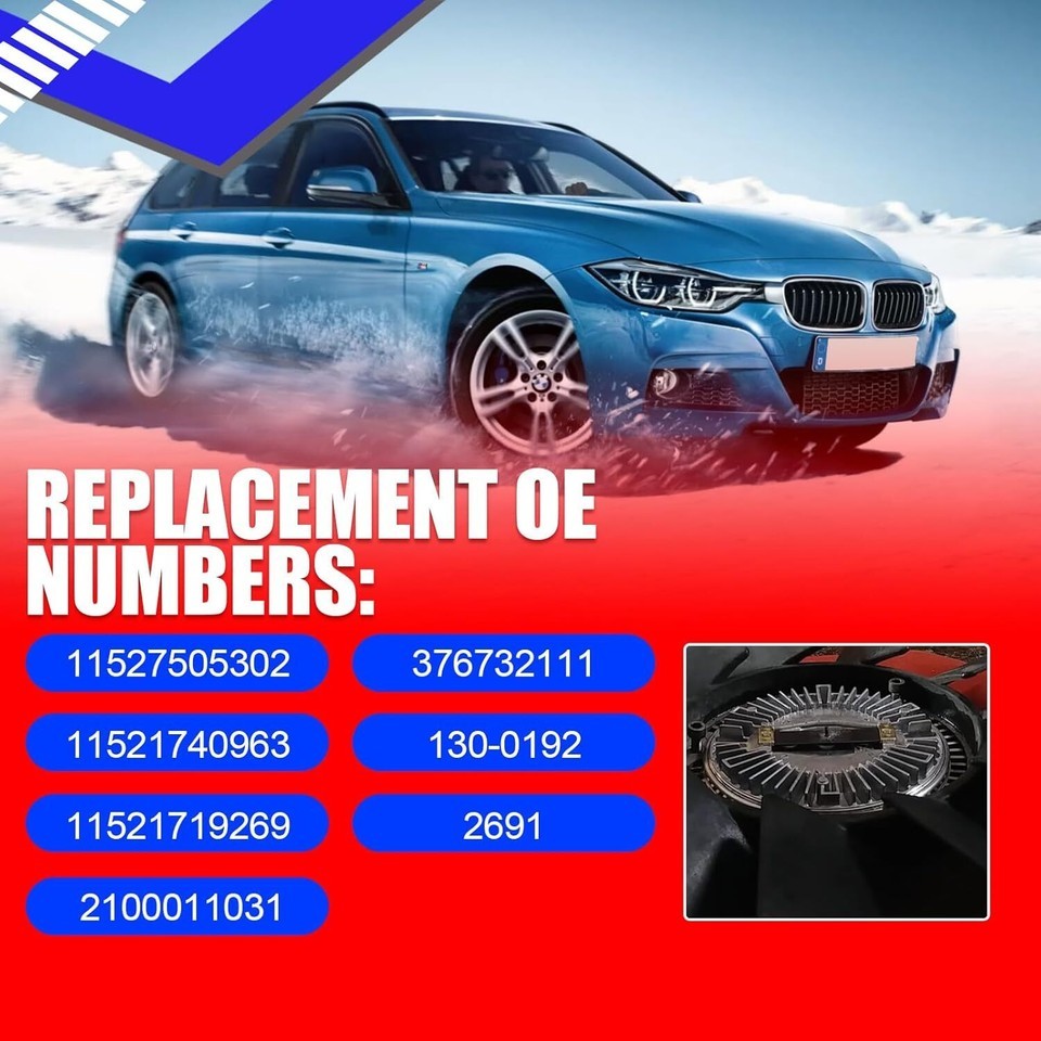 ?FITMENT? - The radiator cooling fan clutch is for BMW 320i (95-93), (05-01), BMW 323Ci (00), BMW 323i (00-98), BMW 323is (99-98), BMW 323ti (00-99), BMW 325Ci (06-01), BMW 325i (95-92), (06-01), BMW 325is (95-92), BMW 325xi (05-01), BMW 328Ci (00), BMW 328i (00-96), BMW 328is (99-96). ?FITMENT? - For BMW 330Ci (06-01), BMW 330i (06-01), BMW 330xi (06-01), BMW 525i (95-91), (03-01), BMW 525iT (93), BMW 528i (00-97), BMW 530i (03-01), BMW L7 (87), BMW M3 (99-95), BMW X5 (06-01), BMW Z3 (02-97). ?REPLACE OE - 11527505302, 11521740963, 2691, 11521719269 Other Part Number: 376732111, 2100011031, 130-0192. The cooling fan clutch for BMW fits the original parts perfectly. ?FUNCTION - SMMS radiator cooling fan clutch, made of high-quality materials, helps maintain engine temperature while the engine operates. It serves as a vital component of the vehicle's cooling system. ?GUARANTEE - If you're not completely satisfied with the SMMS Radiator Fan Clutch, you can simply return it within 30 days. Additionally, it comes with a 12-month warranty, ensuring your purchase is risk-free. Buy with confidence!