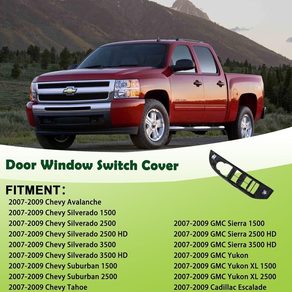 REPLACEMENT PART NUMBER: 25924151,20877646,15920638 COMPATIBLE WITH:This window switch bezel compatible with Chevrolet Suburban 1500 2500/Chevy Silverado 1500 2500 2500 HD 3500 3500 HD/Chevy Avalanche/Chevy Tahoe 2007 2008 2009 07 08 09,GMC Yukon/Yukon XL 1500 2500/GMC Sierra 1500 2500 HD 3500 HD 2007 2008 2009 07 08 09,Cadillac Escalade 2007 2008 2009 07 08 09,Please refer to the vehicle compatibility above to ensure proper part. FEATURES:This front left driver side window switch panel is made of high-quality plastic with features such as heat, wear and corrosion resistance. Replacement new parts fit perfectly with the car to restore the appearance of your window switch plate and help provide a safer driving experience. SERVICE LIFE EASY INSTALLATION:This driver window control switch bezel is not the real original parts, but it uses advanced technology and high-quality materials in line with oem standards, more effective extension of service life, directly replace the old window switch panel trim , easy to install can save you time and money. BUY WITH CONFIDENCE:1-Year Warranty.If you have any questions or concerns about the power door window switch housing,please contact us by email and we will provide you with satisfactory service support.