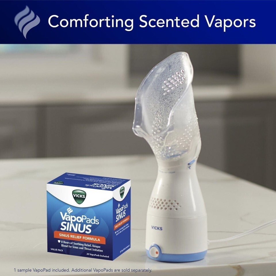 The Vicks Personal Sinus Steam Inhaler helps provide year-round symptomatic relief from cough and congestion caused by colds, seasonal allergies and sinusitis. With an ergonomic designed face mask, it provides a targeted, warm mist of steam for temporary symptomatic relief in a 5-15 minute treatment. It?s also compatible with soothing menthol Vicks VapoPads for added comfort, and includes variable steam control to adjust steam intensity. The nasal steamer is quick and easy to use, penetrating nasal, sinus and throat passages for fast relief. It helps naturally alleviate congestion, dryness and irritation, and may provide sinus relief and help with breathing problems like bronchitis, allergies, and colds with cough and congestion. At Vicks, we believe that everyone deserves a touch of care. Our line of humidifiers, steam inhalers and vaporizers help you breathe better, wherever you are. This Steam Inhaler (with or without Vicks VapoPads) is not recommended for use by children.