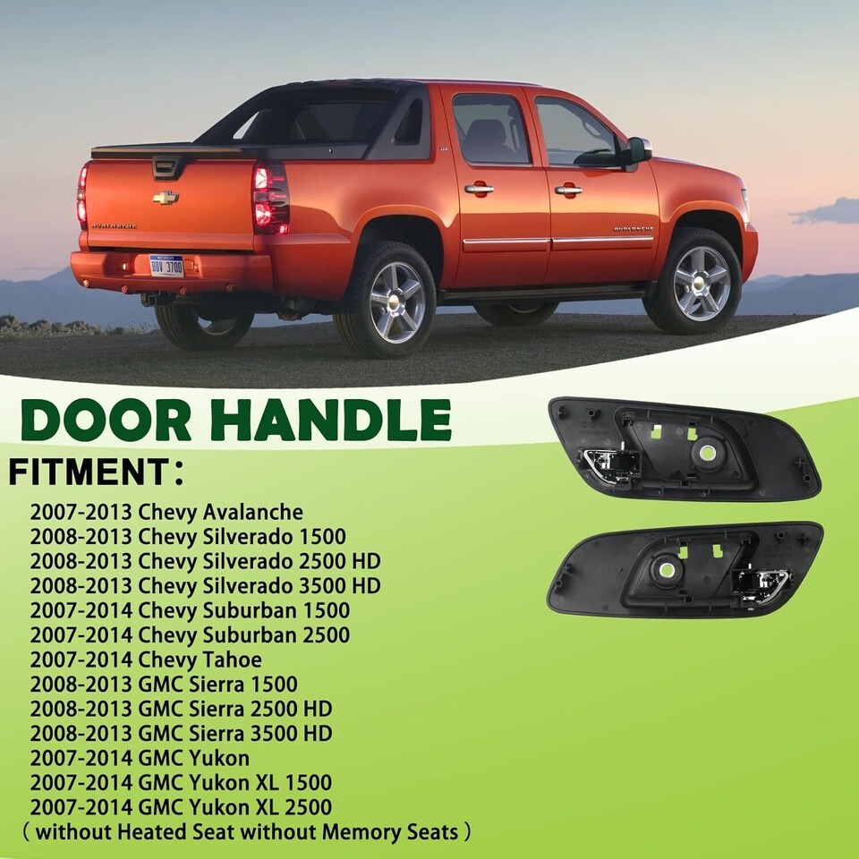 COMPATIBLE WITH: This Interior Door Handles fit for 2007-2013 Chevy Avalanche,2007-2014 Chevy Silverado 1500 2500 HD 3500 HD/ Suburban 1500 2500/Tahoe COMPATIBLE WITH: This Inside door handle kit fit for 2017-2014 GMC Sierra 1500 2500 HD 3500 HD /Yukon XL 1500 2500,Please refer to the vehicle compatibility above to ensure proper part FEATURES: The front driver passenger side inner door handle with upgraded plastic process,high hardness,oxidation resistance,heat resistance, corrosion resistance,replacement of new parts and car perfect fit,Solve your safety problems while making your car look new and more beautiful SERVICE LIFE EASY INSTALLATION: This front pull handles are not the real original parts,but it uses advanced technology and high-quality materials in line with oem standards,more effective extension of service life,directly replace the old handle, easy to install can save you time and money BUY WITH CONFIDENCE: 1-Year Warranty.If you have any questions or concerns about the Interior door handle without hole,please contact us by email and we will provide you with satisfactory service support